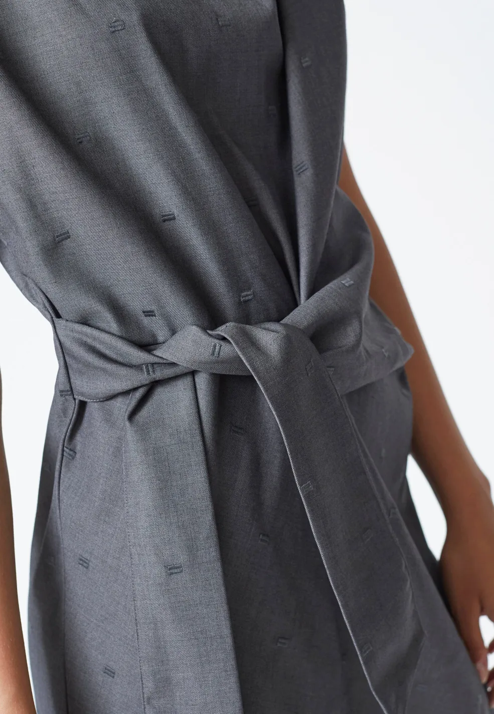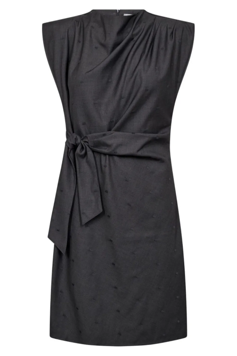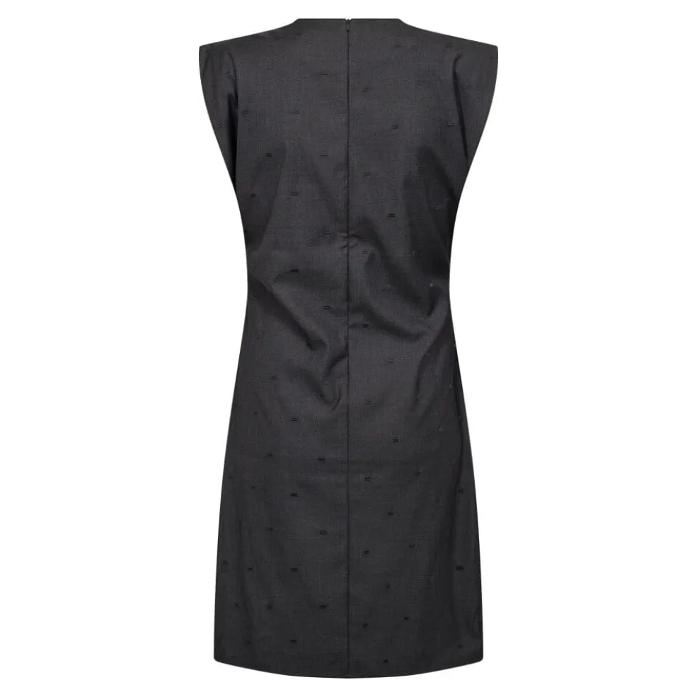 Midtegrå kjole fra Co´Couture med et diskret print. Kjolen har høj halsudskæring, er ærmeløs og går til låret.