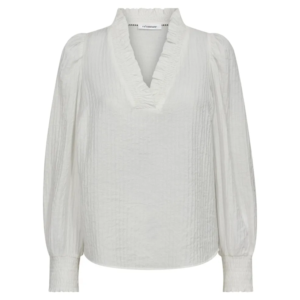 En hvid bluse fra Co´Couture med V-udskæring og rynket tekstur. Blusen er lavet af 85 % viskose og 15 % polyamid.