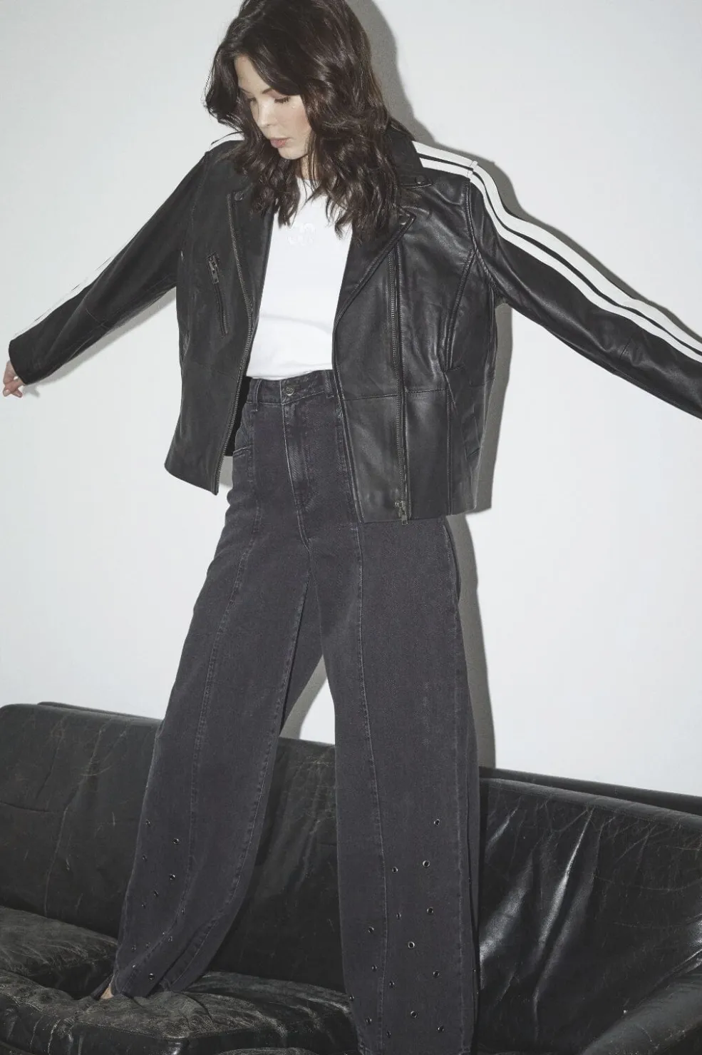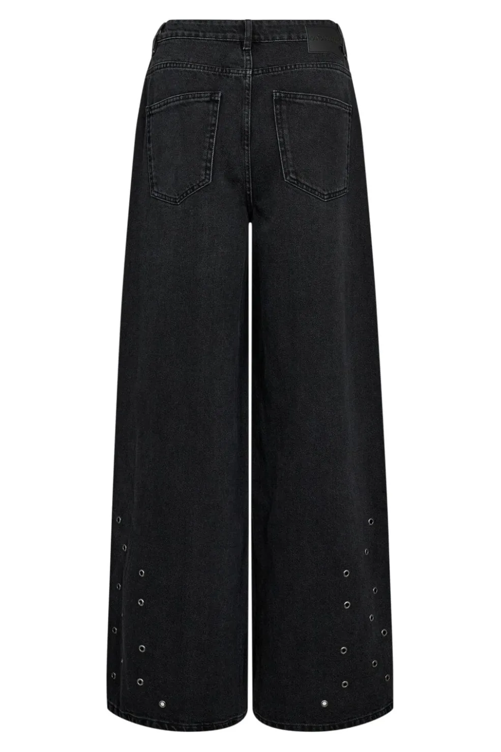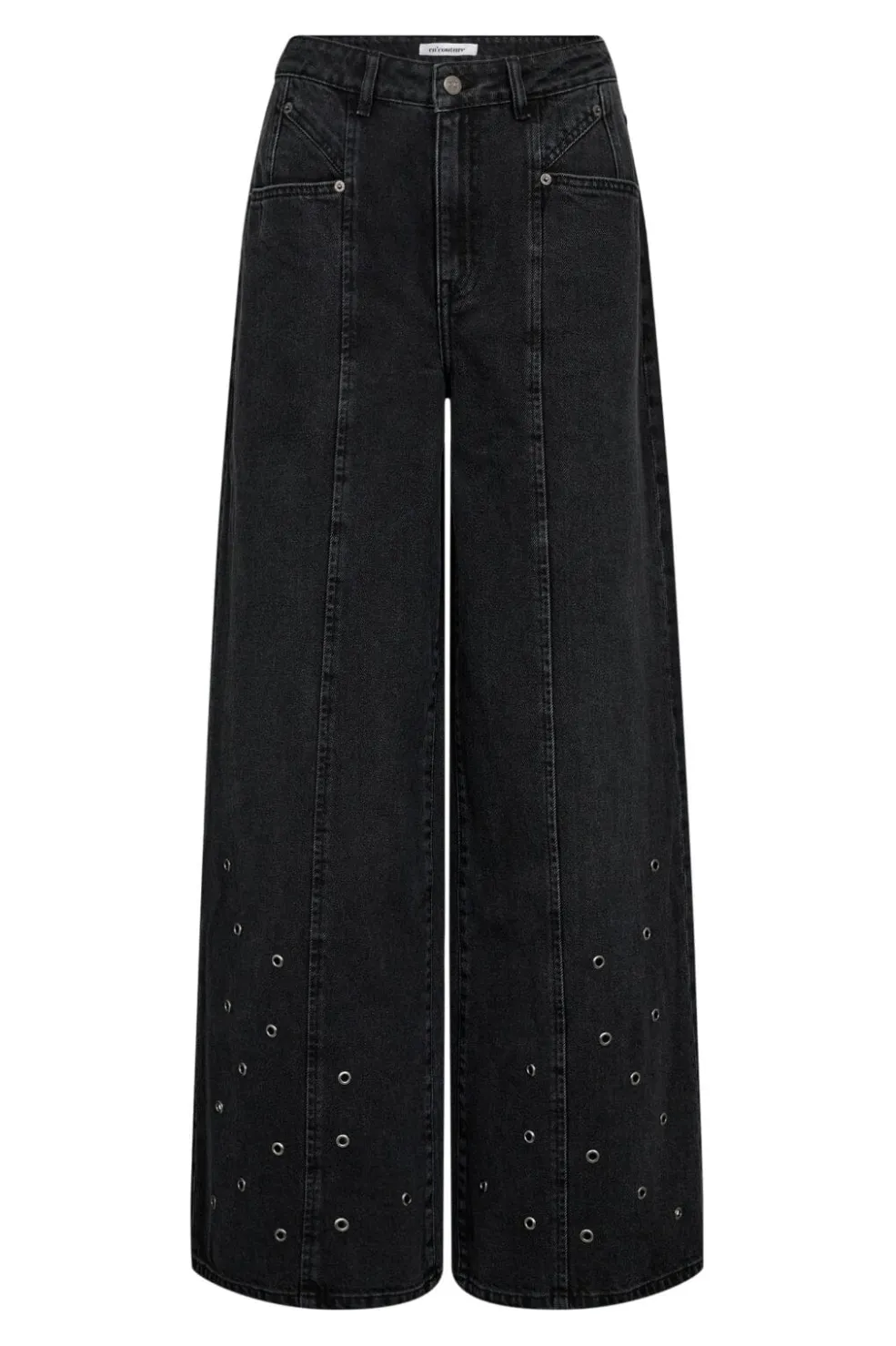 Sorte jeans fra Co´Couture med brede ben og øjelet-detaljer langs siderne. Højtaljede bukser i fuld længde med en bred pasform og dekorative huller langs benene.