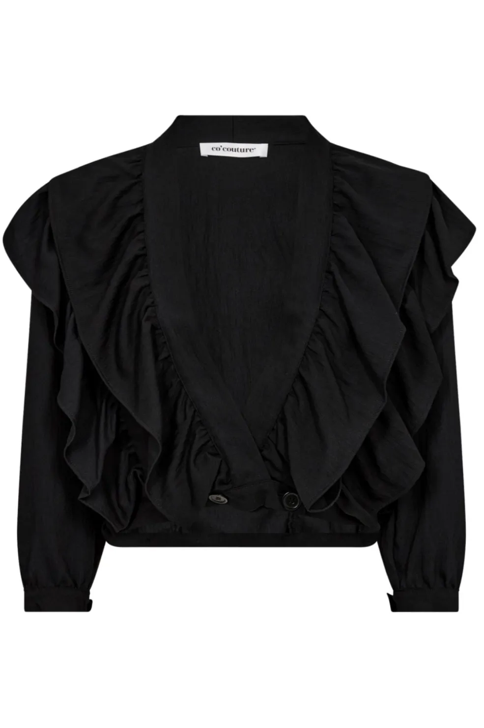 Sort bluse fra Co´couture med store flæser langs for- og bagside. Blusen har en dyb V-udskæring og lange ærmer med manchetter. Den har knapper som lukning.