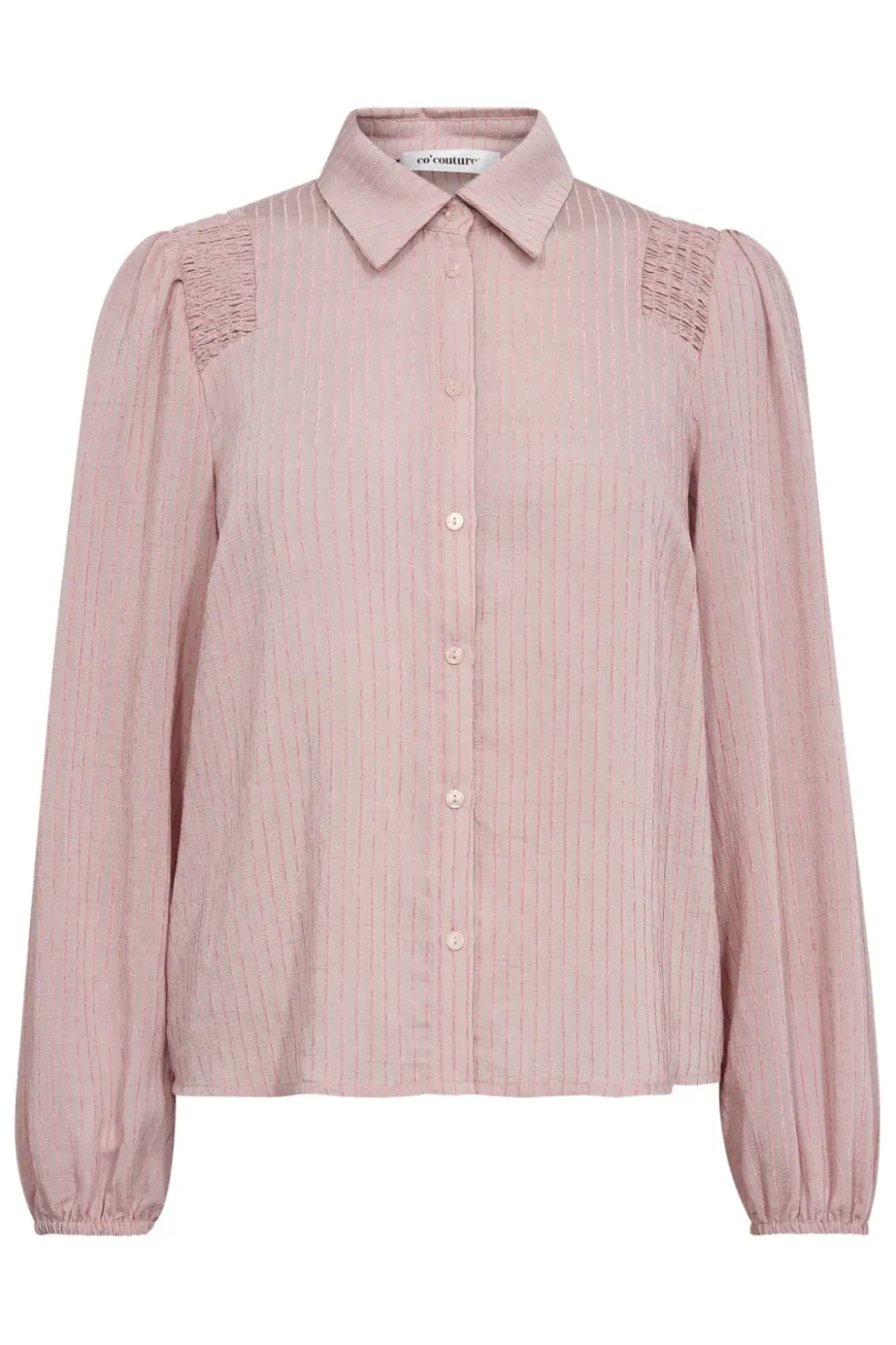 Bleg pink skjorte fra Co´Couture med stribedetaljer og smock på skuldrene. Skjorten har lange ærmer med manchetter og en klassisk skjortekrave med knaplukning foran.