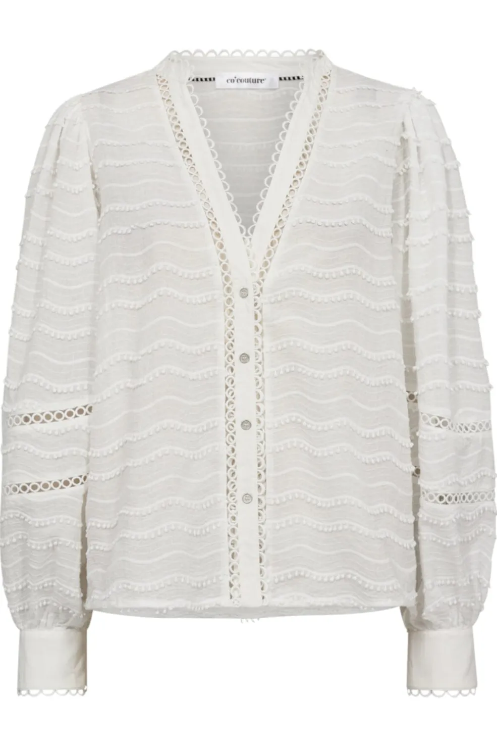 Off-white skjorte fra Co’couture med bølgemønster og blondekant. V-udskæring og knaplukning foran giver skjorten et let udtryk.