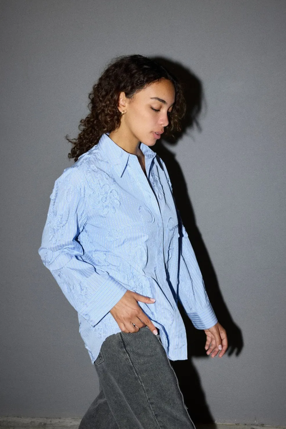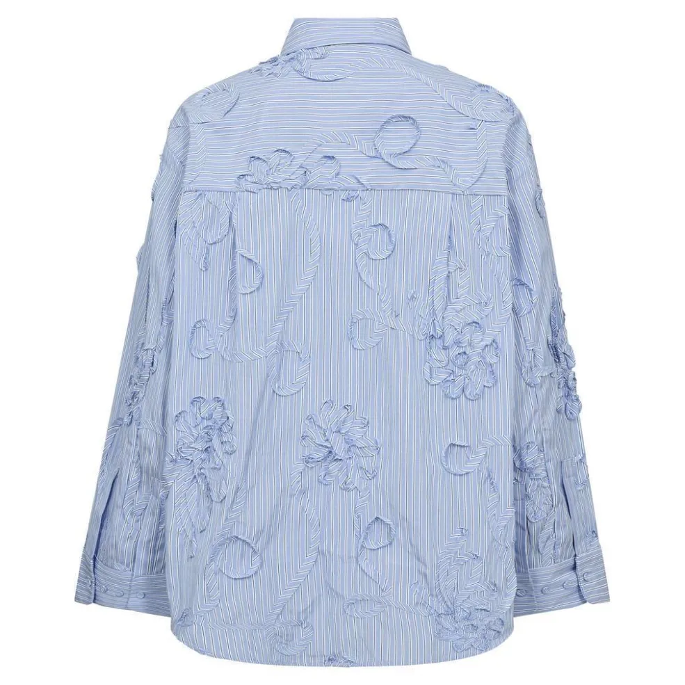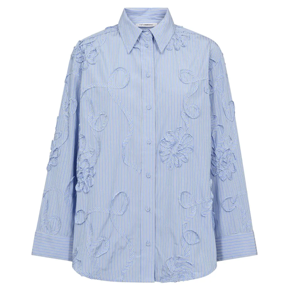 Stribet skjorte fra Co´Couture i lys blå med hvide striber. Skjorten har broderede blomsterdetaljer og rynker i stoffet.