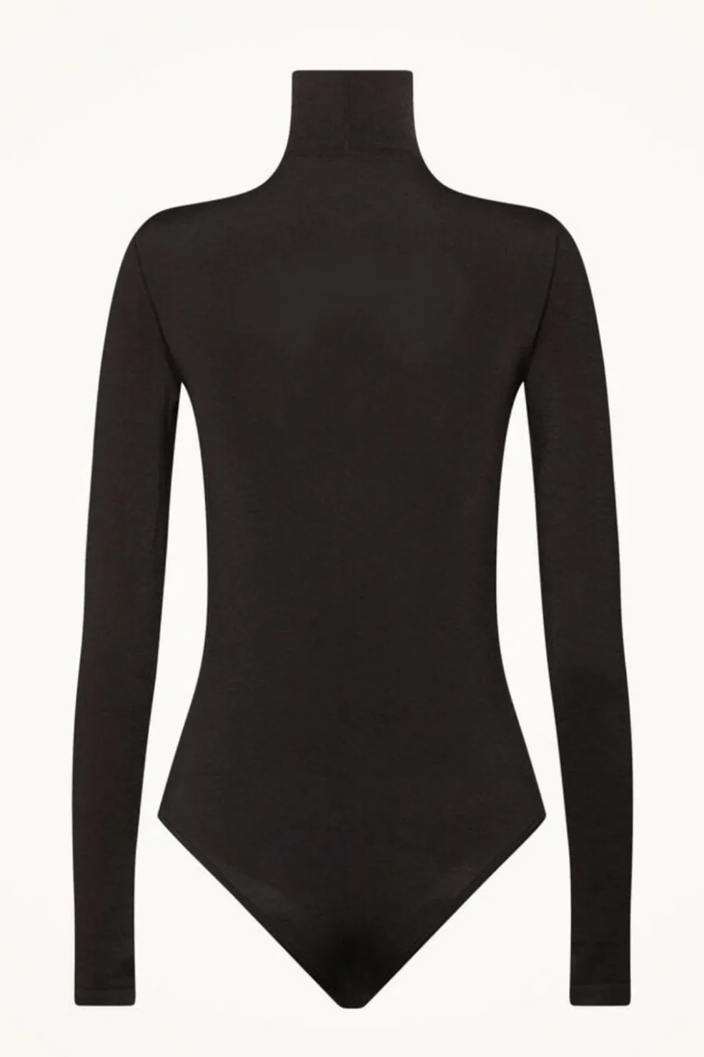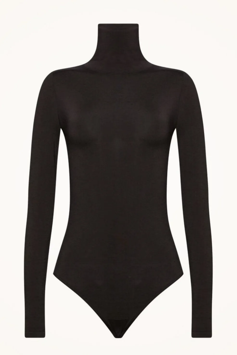 Sort body fra Wolford med høj hals og lange ærmer. Den tætsiddende pasform giver en glat silhuet under tøjet.