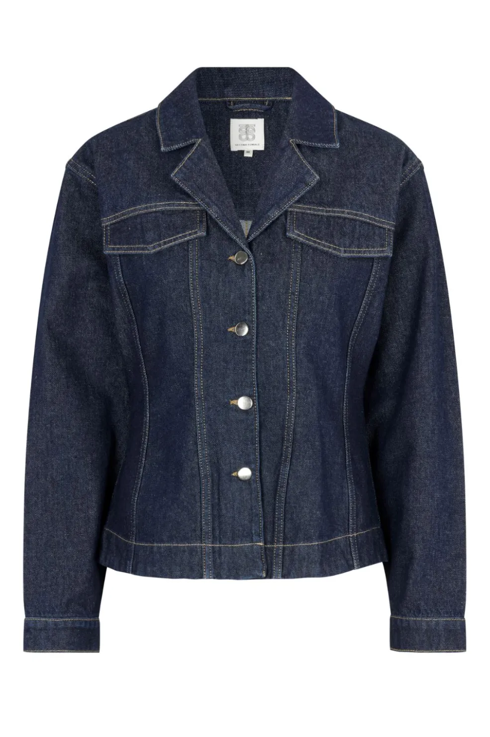 Mørkeblå denimjakke fra Second Female med skjortekrave og sølvknapper. Jakken har brystlommer med klapper og dekorative kontraststikninger, der fremhæver det klassiske design.