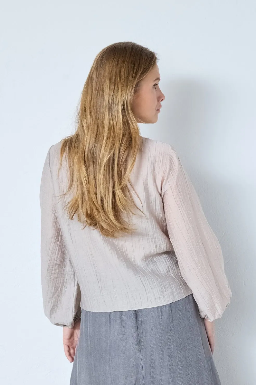 Bluse fra Co´Couture i beige-brun nuance med draperet front. Blusen har lange ærmer og en løs pasform.
