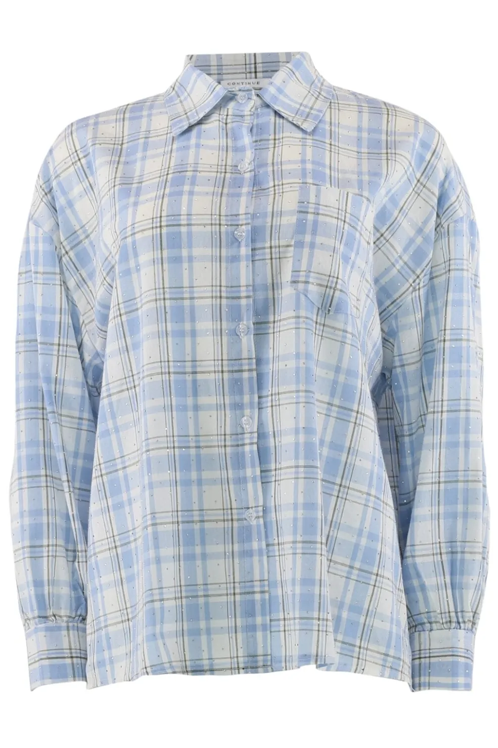Skjortebluse i lyseblå og hvid tern fra Continue. Den løse pasform og de lange ærmer giver en afslappet stil, mens det klassiske ternede mønster skaber et rent udtryk.