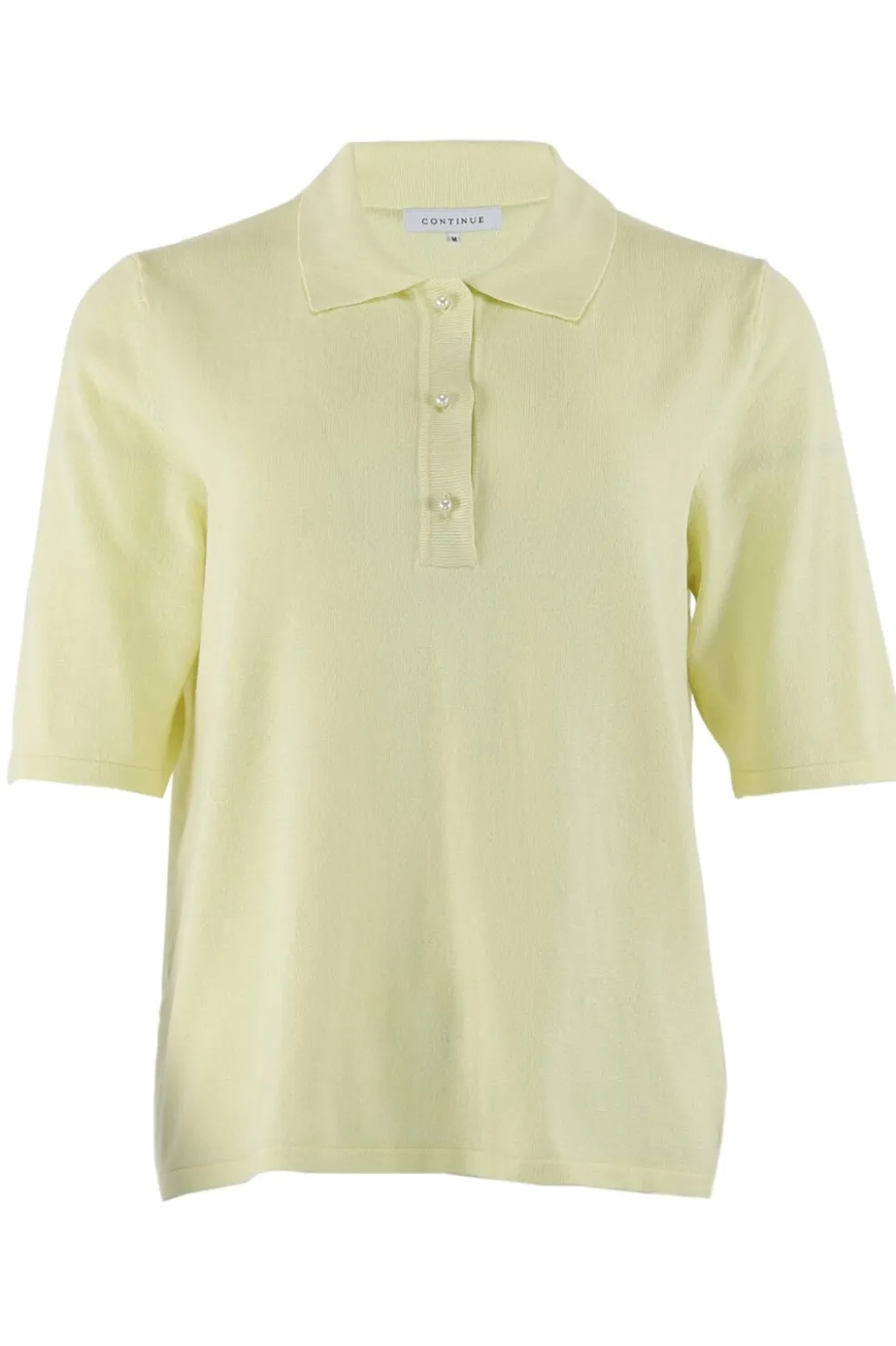 Polobluse fra Continue i en lys citrusfarve. Blusen har korte ærmer og en klassisk polokrave med knapper. Perledetaljerne på kraven giver et fint touch.