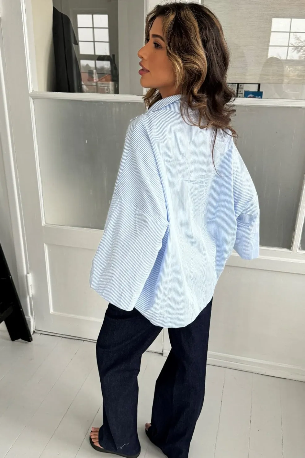 Stribet skjorte fra Continue i lyseblå og hvide striber. Skjorten har en klassisk skjortekrave og 3/4-ærmer med knapper langs siderne. Den løse pasform giver god bevægelsesfrihed.