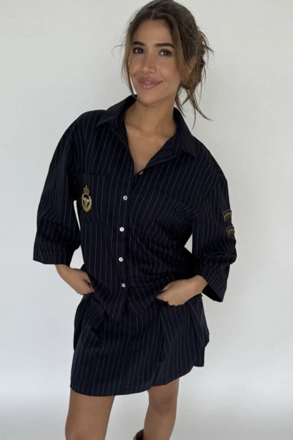 Mørkeblå skjorte fra Continue med striber og broderet patch. Skjorten har en løs pasform med 3/4 ærmer og skjortekrave, hvilket gør den praktisk til både hverdag og fest.