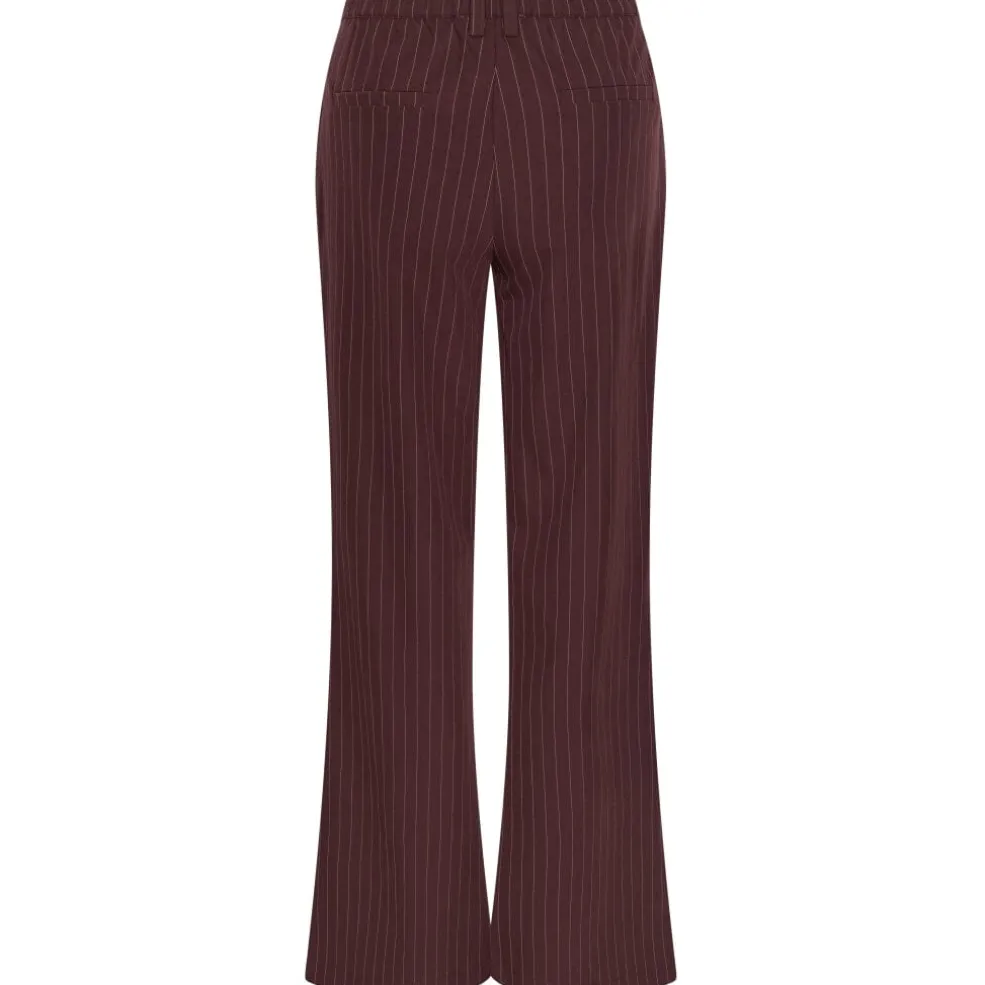 Bukser fra Continue i bordeaux med pinstripe-mønster. Bukserne har en lang pasform og lukkes med lynlås og knapper.