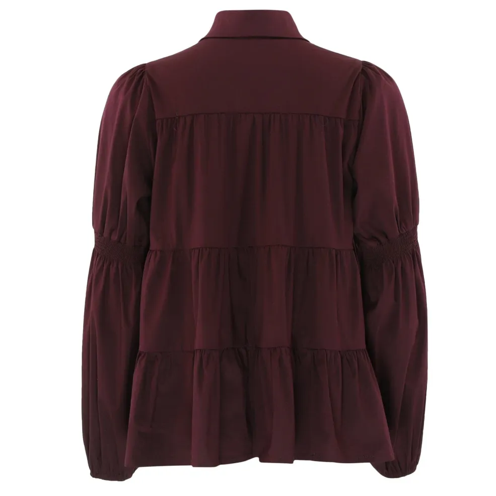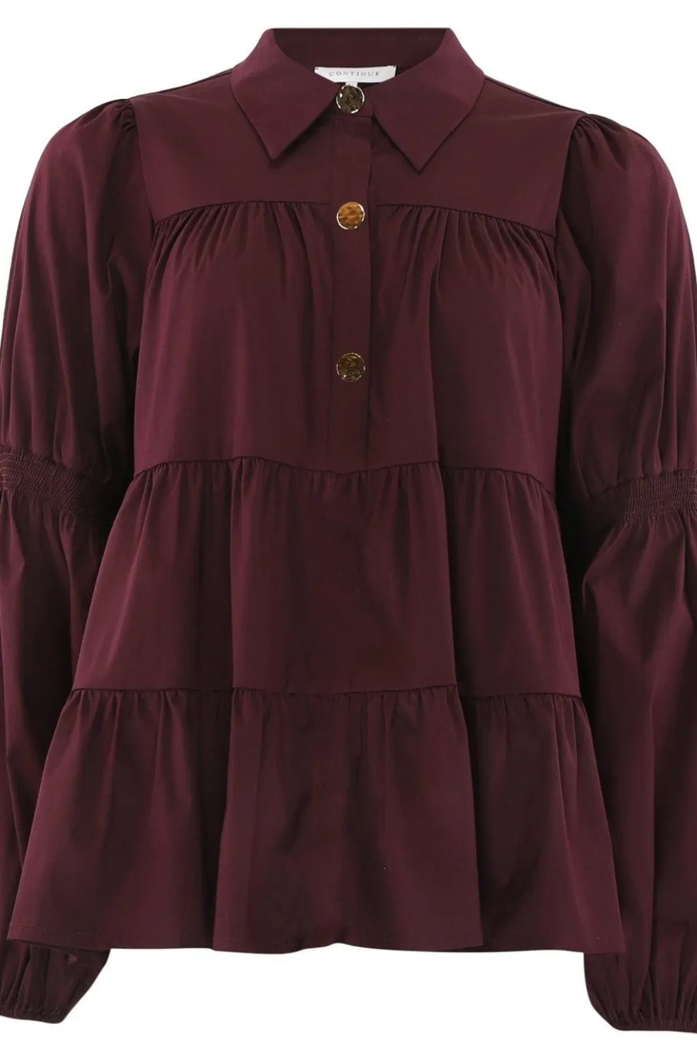 Bordeaux-bluse fra Continue med gyldne knapper foran og flæser. Blusen har skjortekrave og lange ærmer med elastik ved manchetterne.