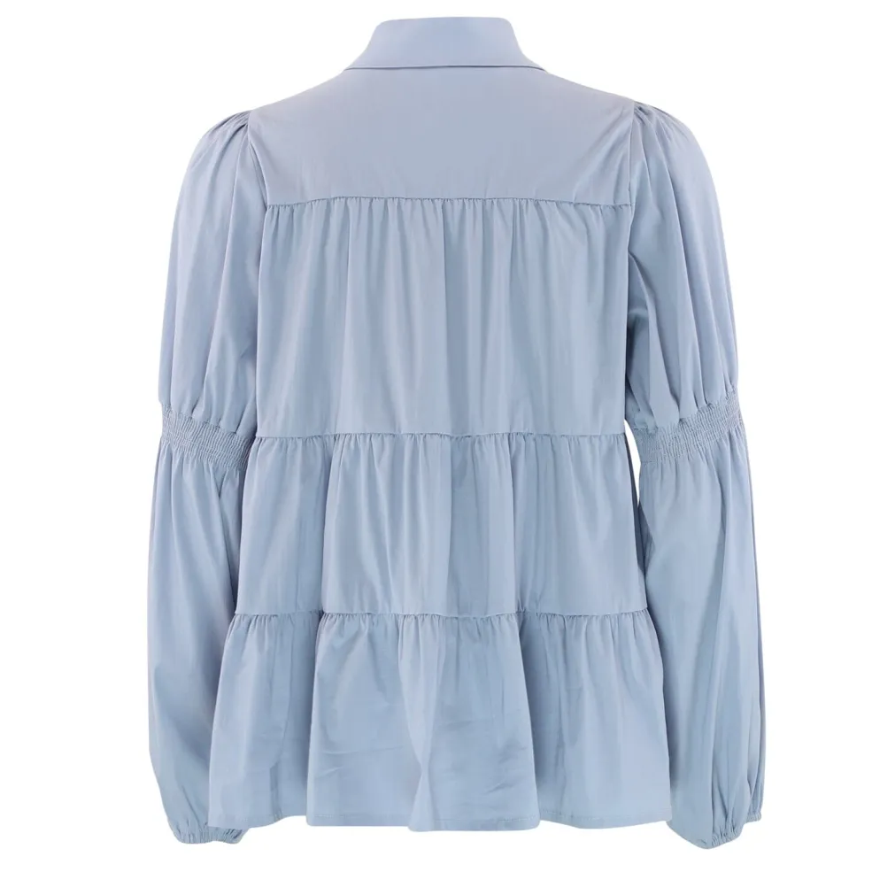 Lyseblå bluse fra Continue, lavet af bomuld, polyester og elastan. Blusen har lange ærmer med rynkede sektioner ved manchetterne og tre guldknapper på forsiden.