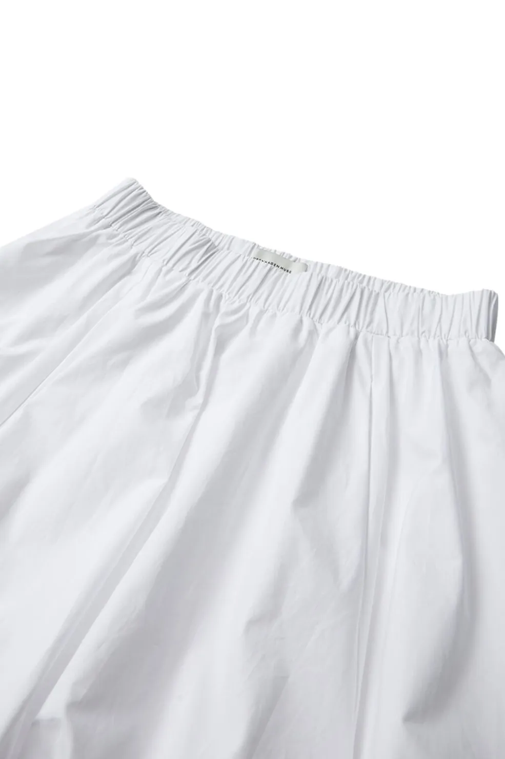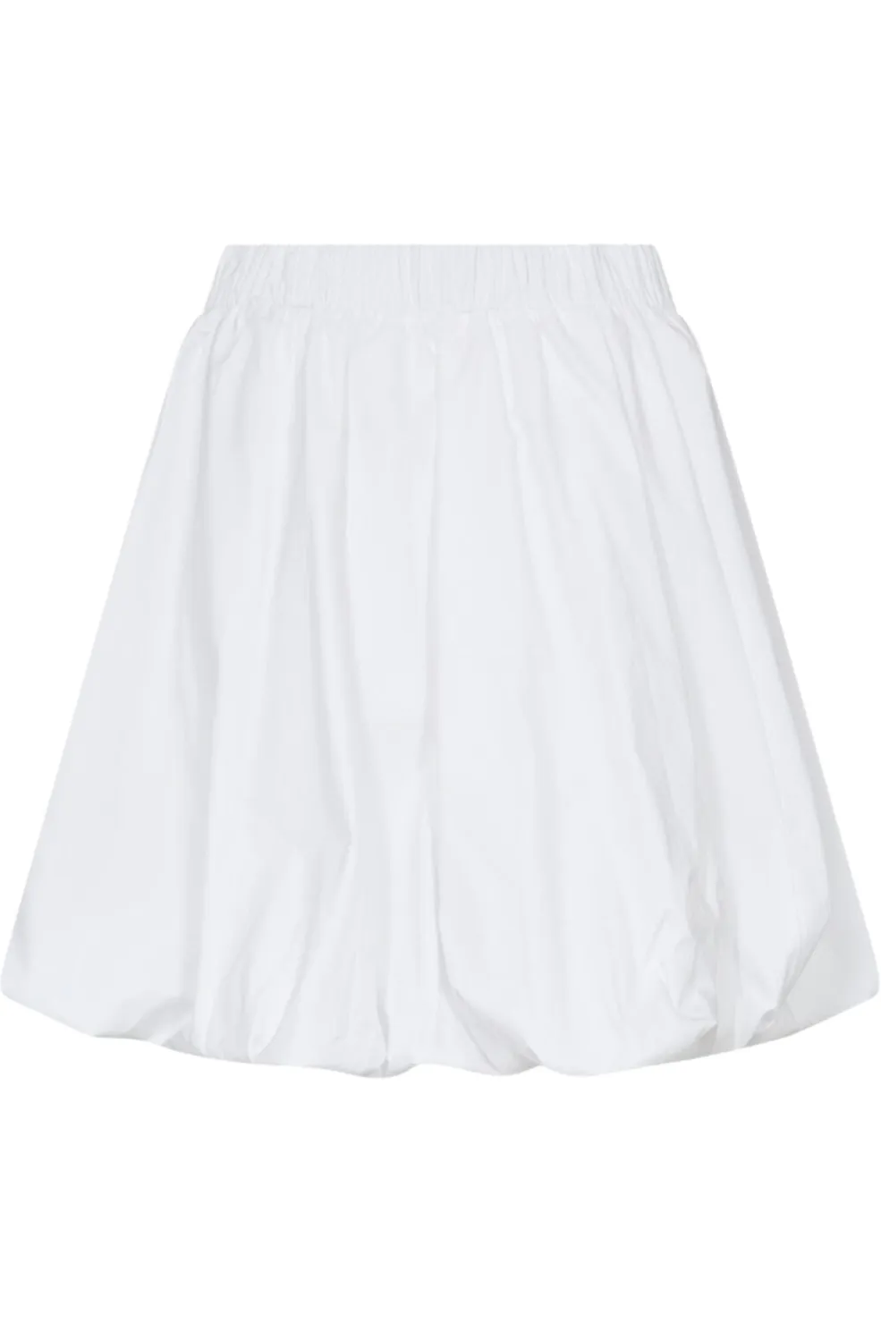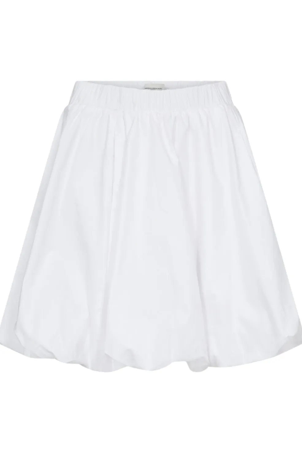 Hvid nederdel fra Copenhagen Muse med flæsedetaljer og elastisk talje. Nederdelen har en rund form og går til midt på låret.