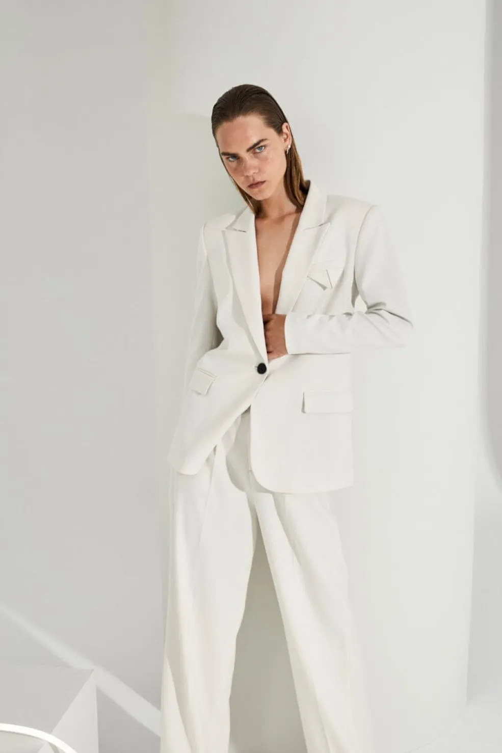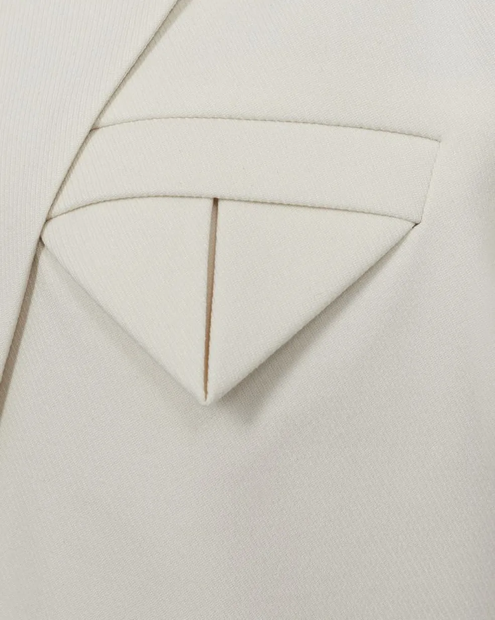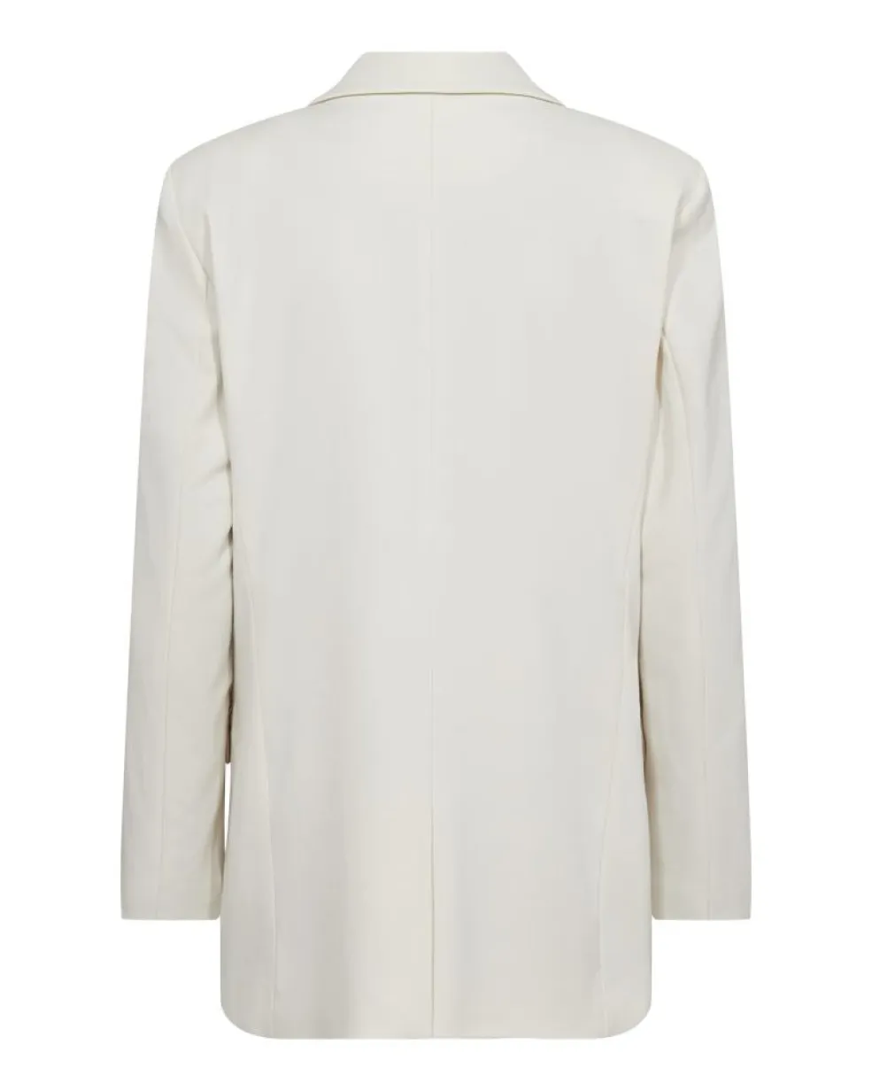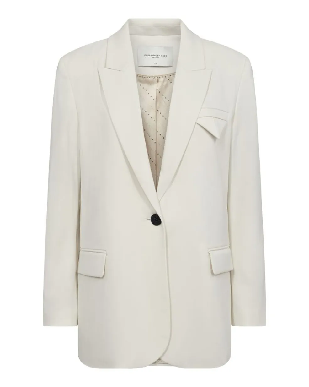 Cremehvid blazer fra Copenhagen Muse med skjortekrave og knaplukning. En blazer i et enkelt design med lange ærmer og dekorative syninger.