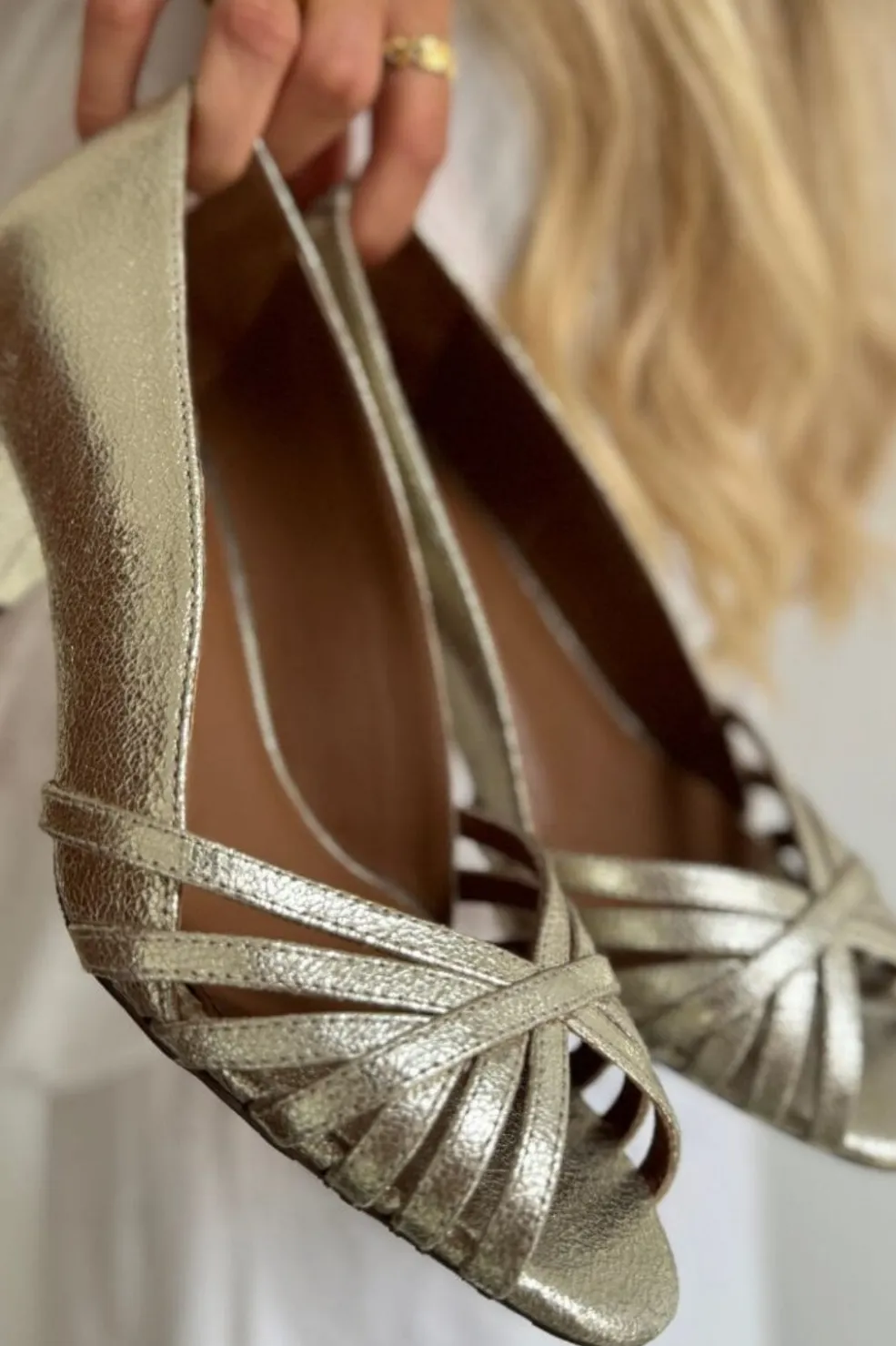 Metalliske festsko i læder fra Copenhagen Shoes. De smalle remme hen over tæerne og den åbne tå giver skoene et let udtryk. Indersålen med latexskum sikrer god komfort.