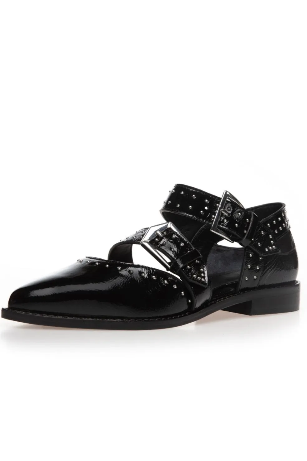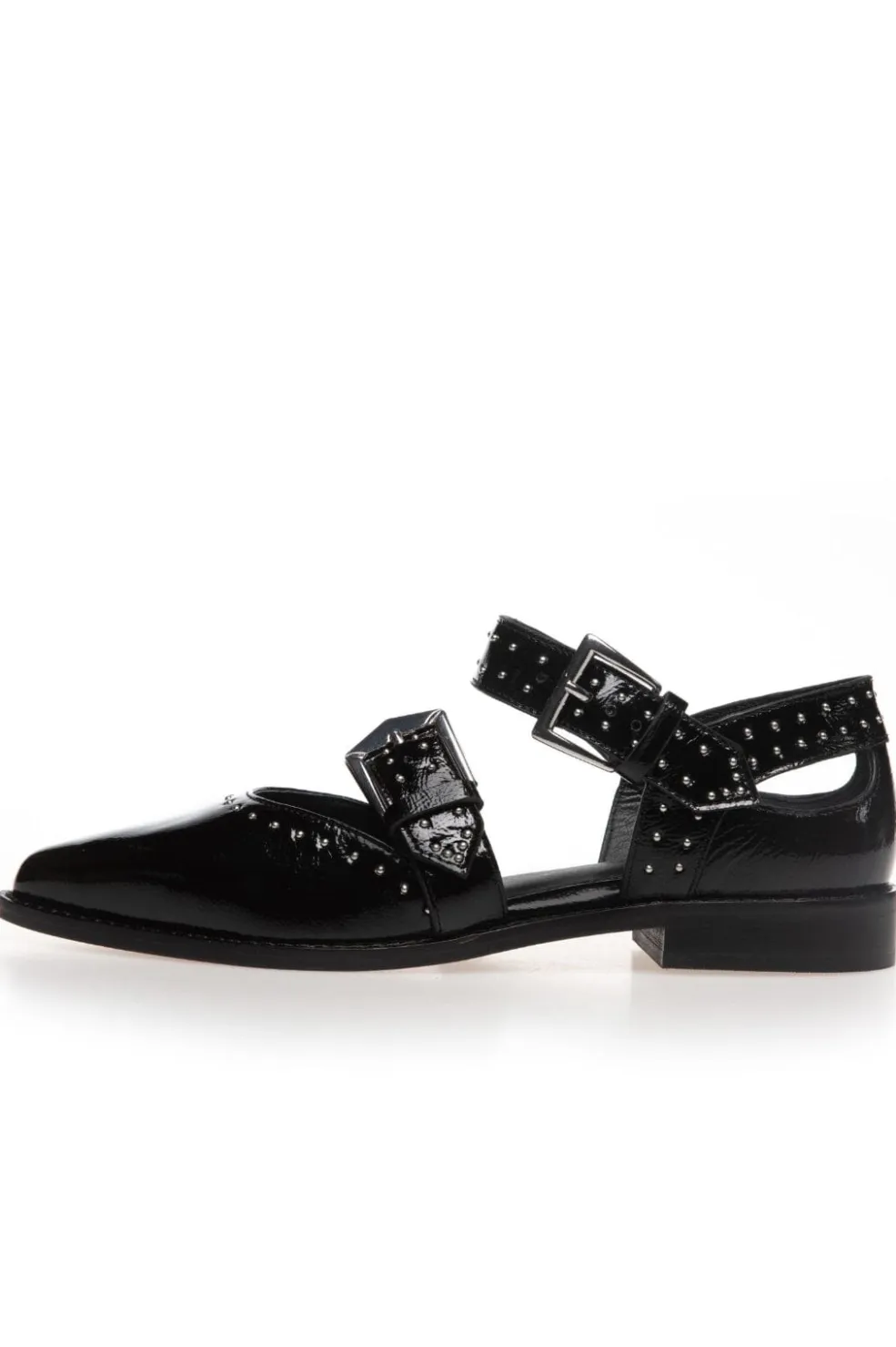 Sorte sko fra Copenhagen Shoes med blank patentoverflade. Skoene har en spids tå og to spænderemme over vristen med sølvfarvede spænder.
