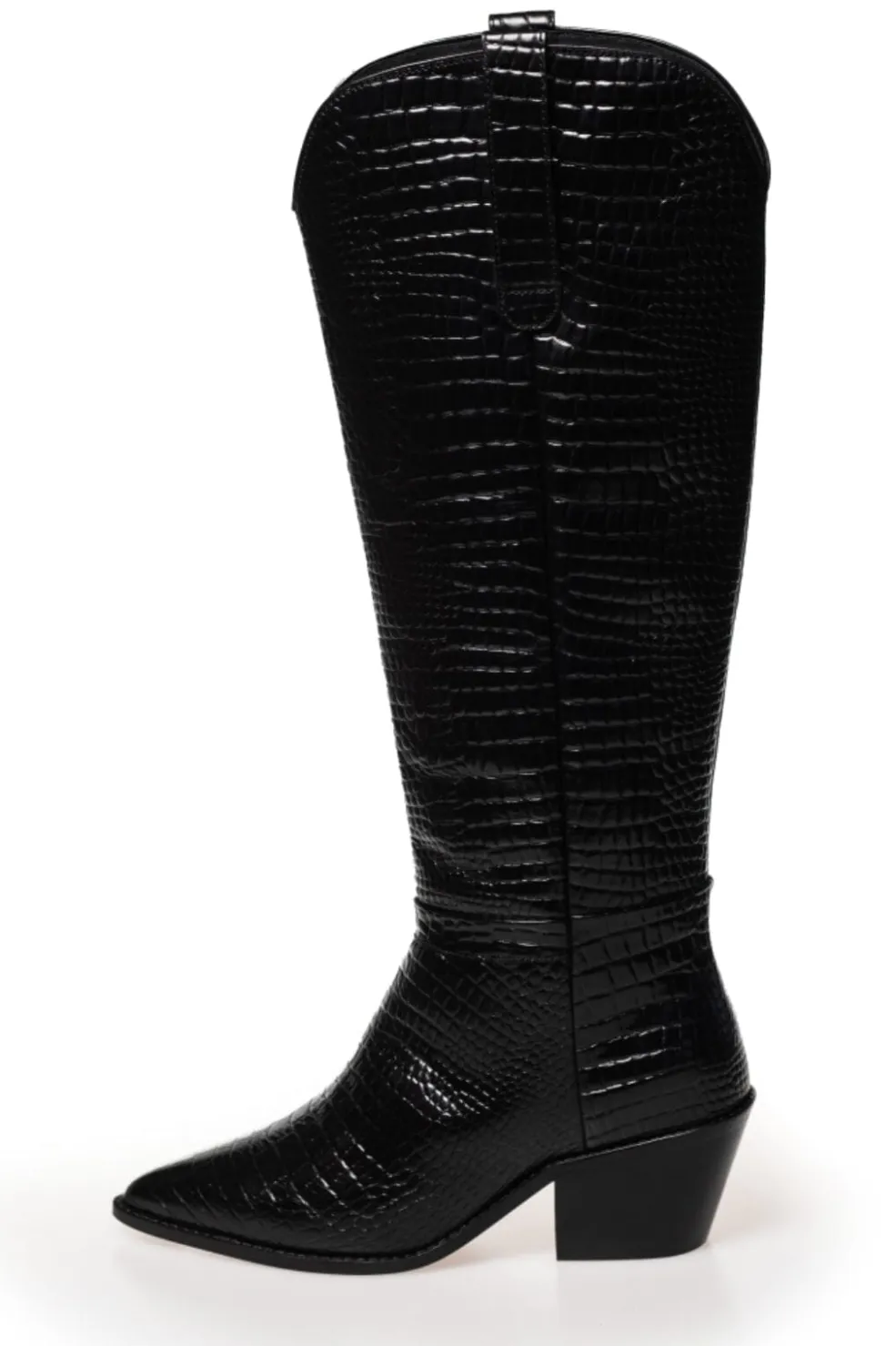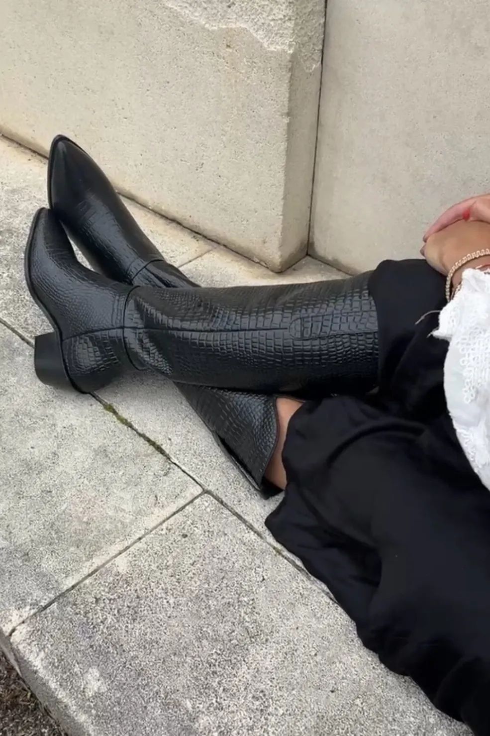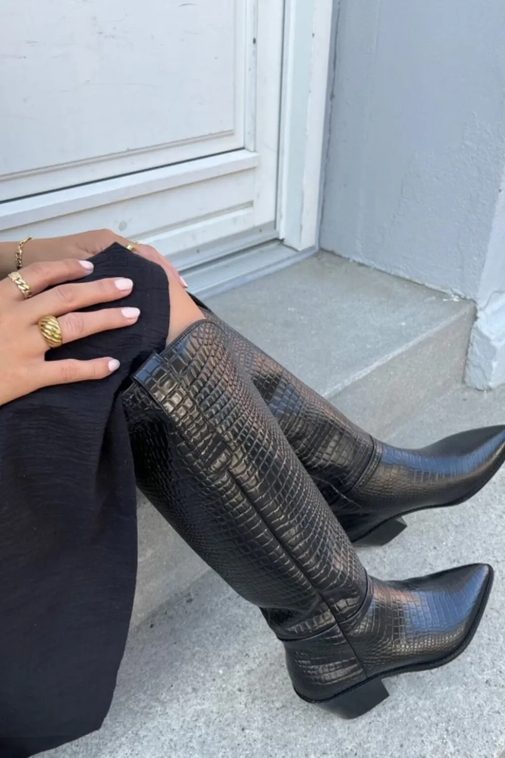 Sorte knæhøje støvler fra Copenhagen Shoes med krokodillemønster i læder. Støvlerne har spids tå og en mellemhøj blokhæl med fleksibel gummisål.