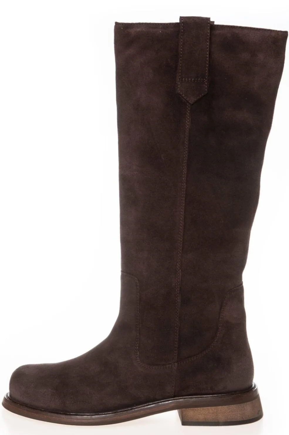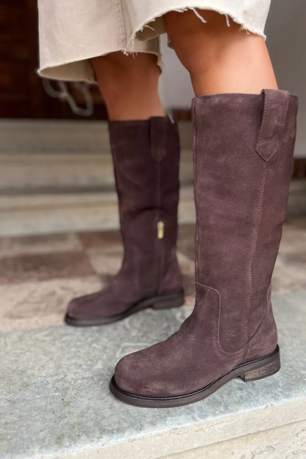 Knæhøj støvle i brun ruskind med rund tå. Støvlen har en lav blokhæl og lynlås i siden. Den brune nuance giver støvlen et rustikt udtryk.