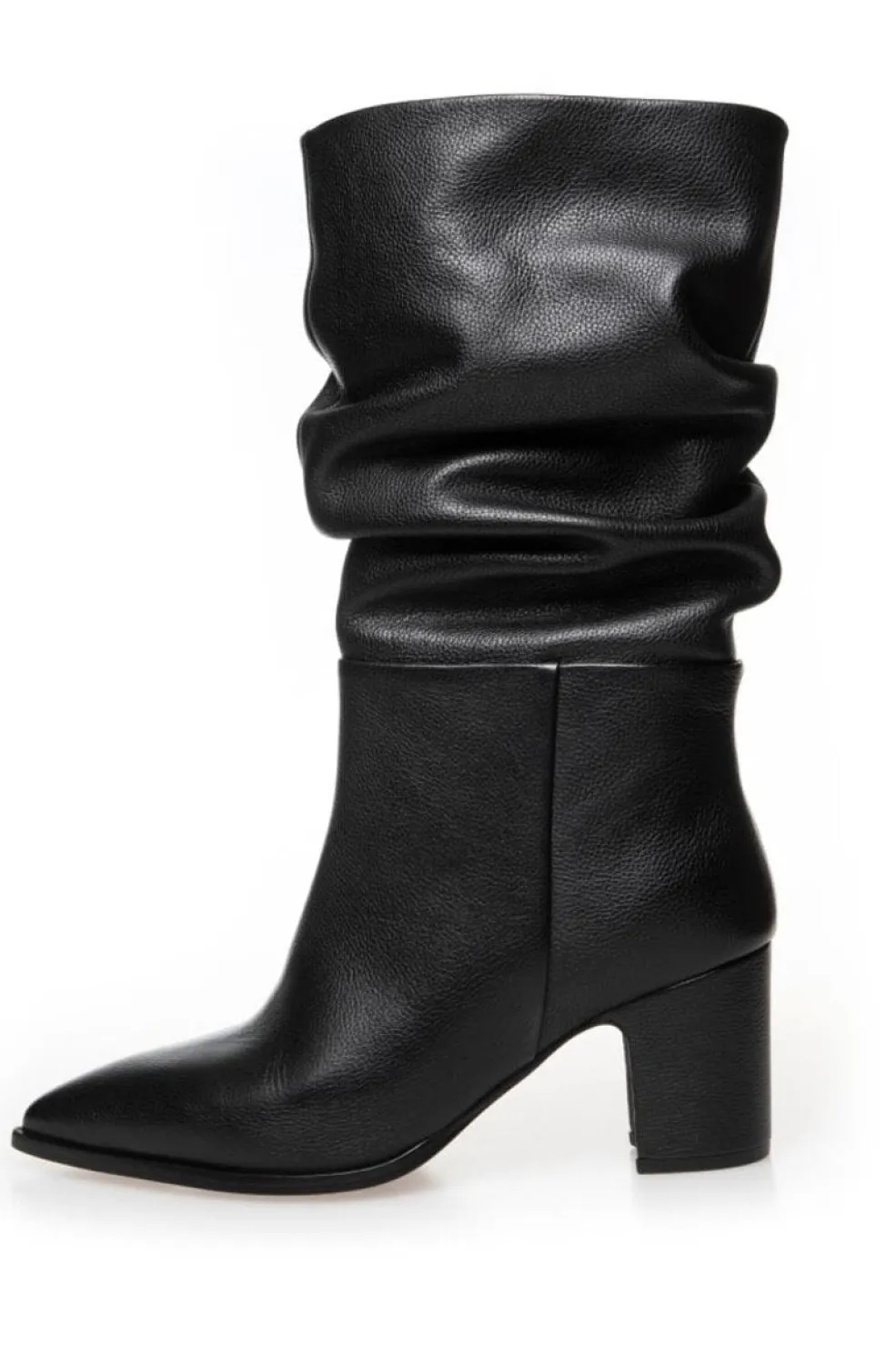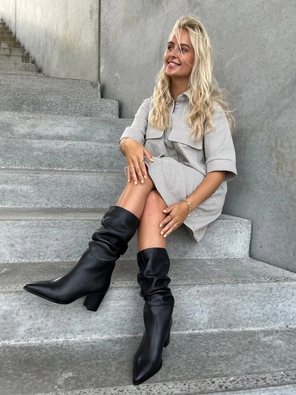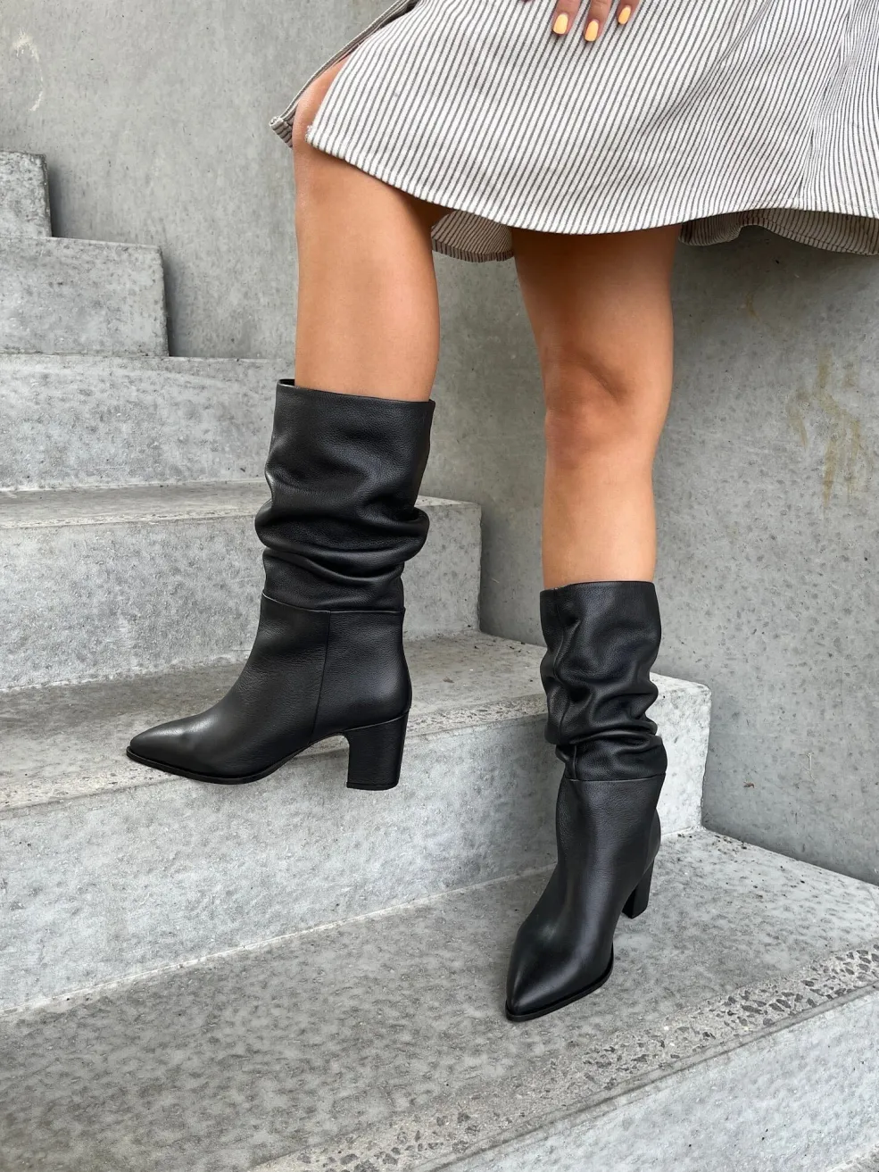 Sorte støvler i læder med krøllet skaft og spids tå. Indersålen har 4-6 mm Copenhagen Shoes-skum, og støvlen står på en 5-8 cm blokhæl.