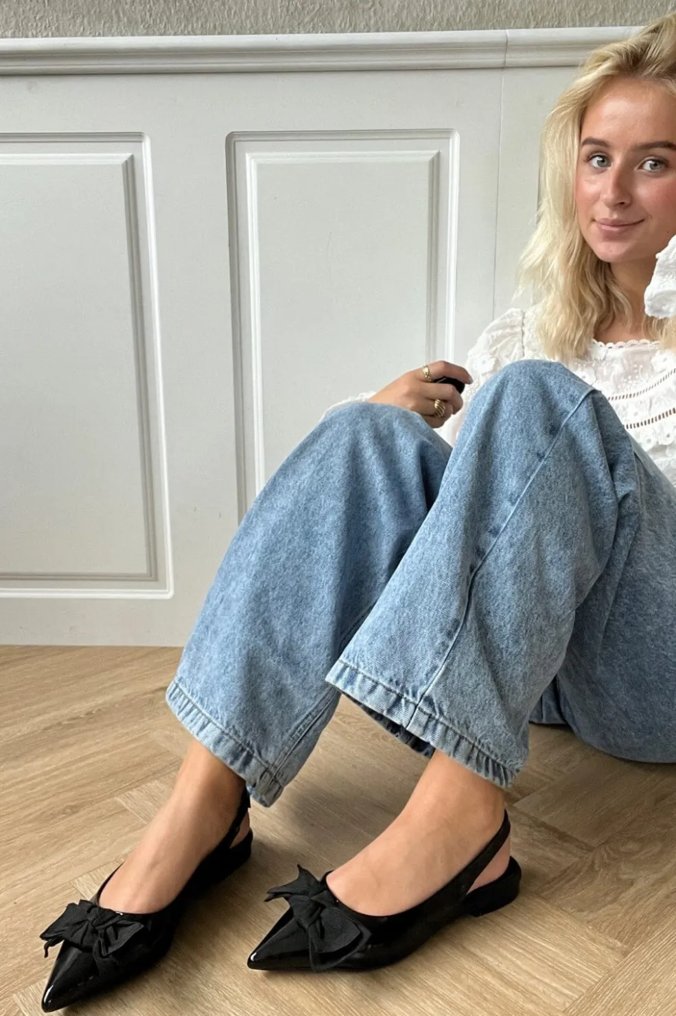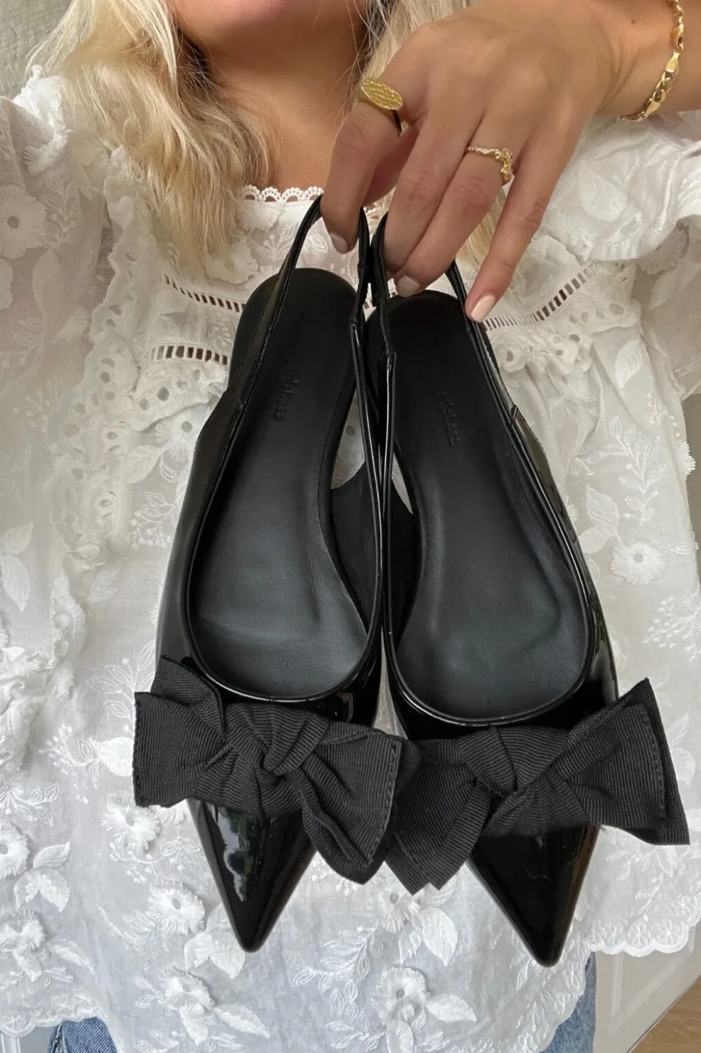 Sorte slingback-sko fra Copenhagen Shoes med blank patentoverflade. Skoene har en spids tå og en dekorativ sløjfe foran, der passer godt til festlige anledninger.