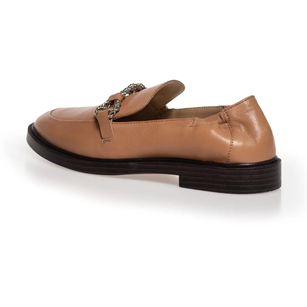 Loafers fra Copenhagen Shoes i blødt læder med cappuccinofarve. Skoen har en specialdesignet latexskum-indersål og dekorative syninger med kædedetalje i guldmetal.