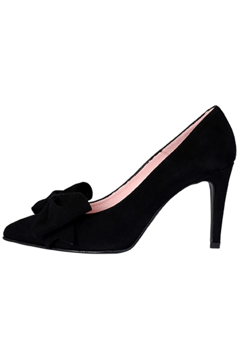 Sorte stiletter i ruskind og læder med spids tå og sløjfedetalje. Skoene har en stilethæl på 8-10 cm og passer godt til festlige arrangementer.