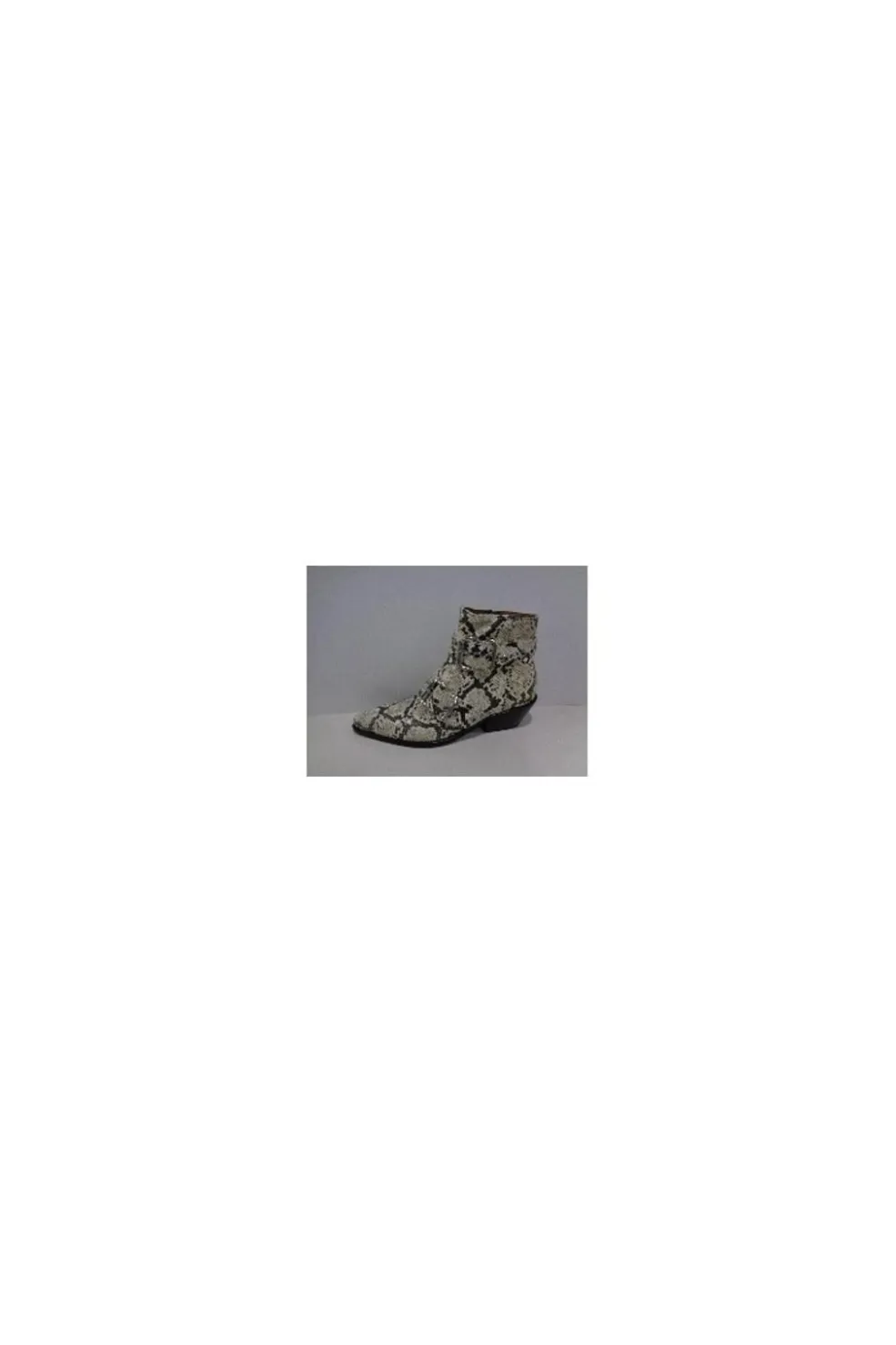 Ankelstøvle fra Copenhagen Shoes i sort og off-white ruskind med slangeskindsprint. Støvlen har spids tå og to sølvspænder på ydersiden.
