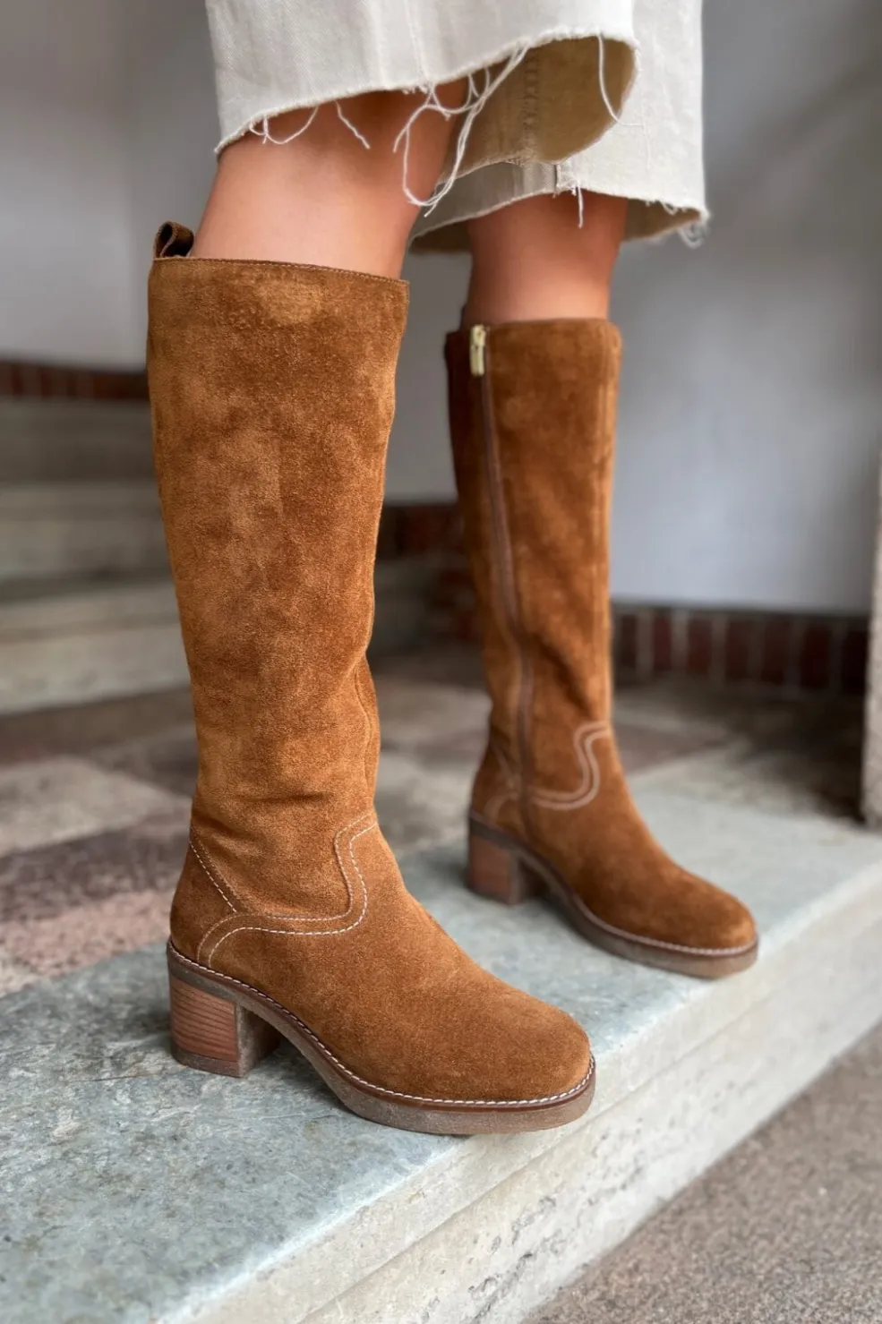 Knæhøj støvle fra Copenhagen Shoes i brun ruskind. Støvlen har en blokhæl på 8-10 cm og rund tå med dekorative syninger.