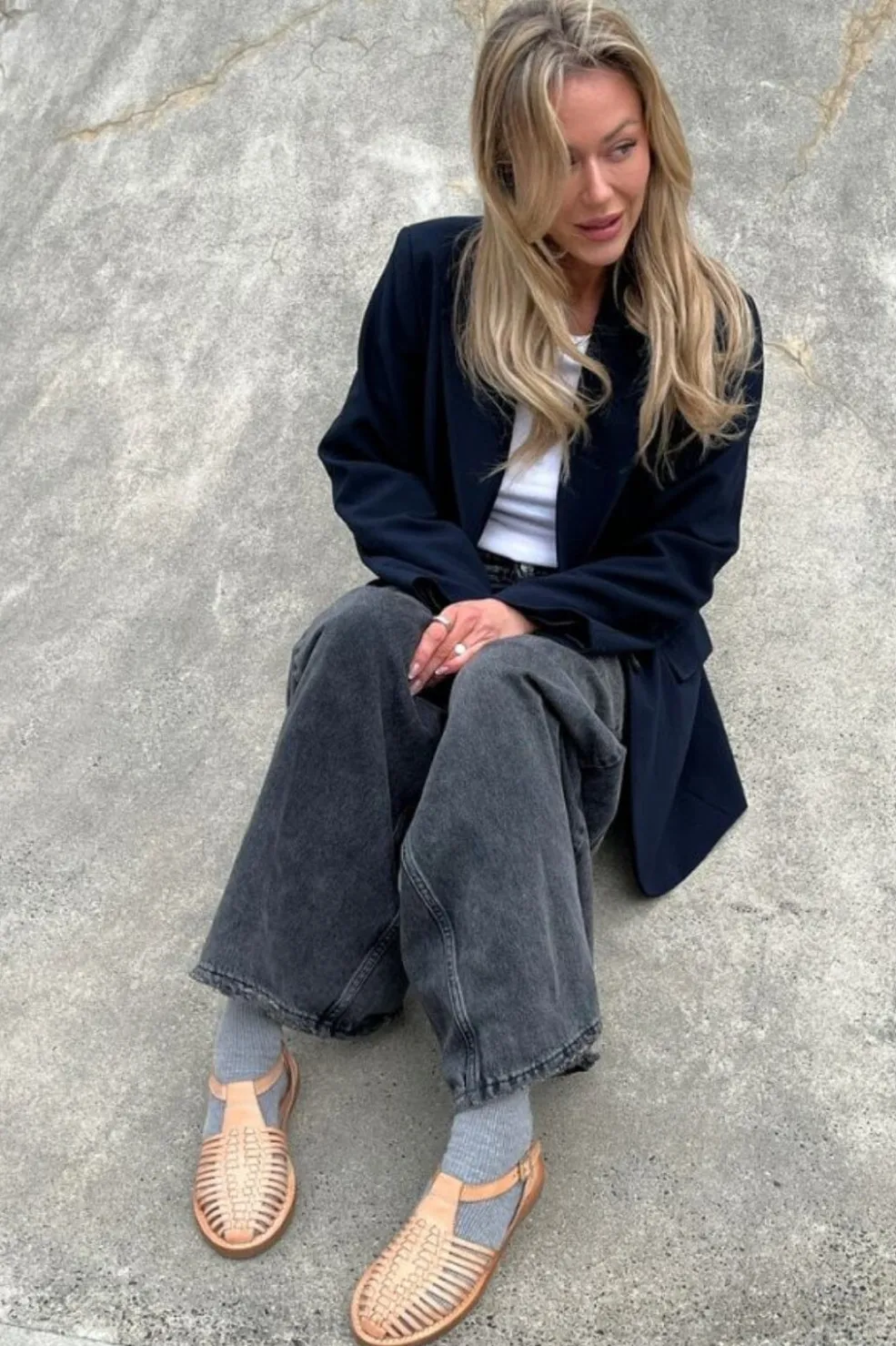 Sandal fra Copenhagen Shoes i naturfarvet læder med flettede remme. De bløde remme og den lukkede hælkappe giver både støtte og ventilation til foden.