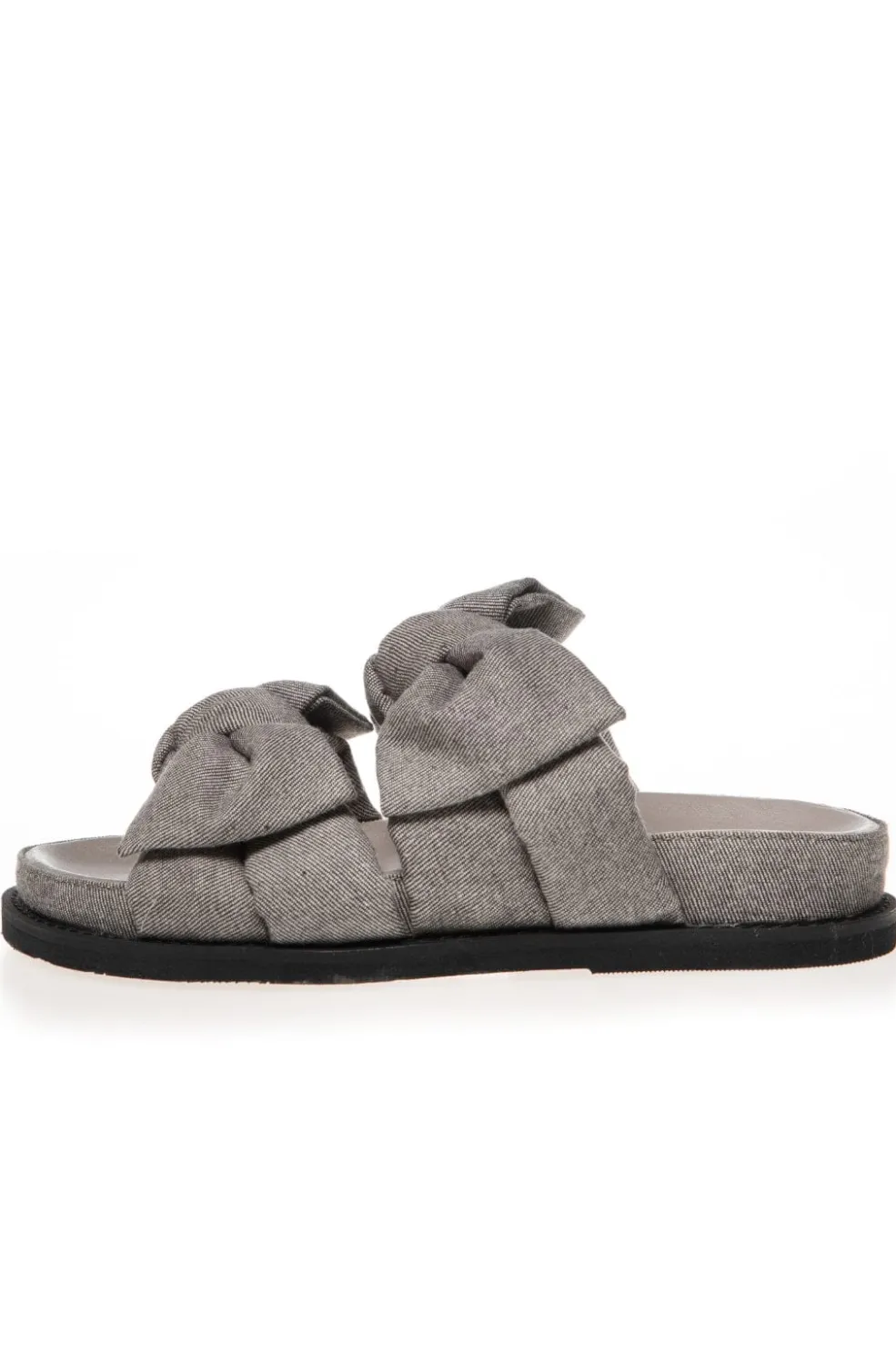 Grå denimsandaler fra Copenhagen Shoes med dekorative sløjfer. Sandalerne har en flad sål og passer til både hverdag og festlige lejligheder.