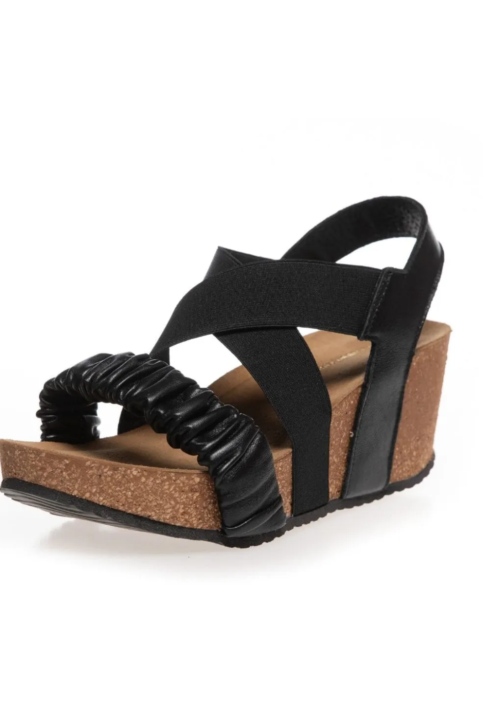 Sorte sandaler fra Copenhagen Shoes med krydsremme og korklignende sål. Sandalerne kombinerer ruskind og læder med en wedge-hæl, der giver god støtte.