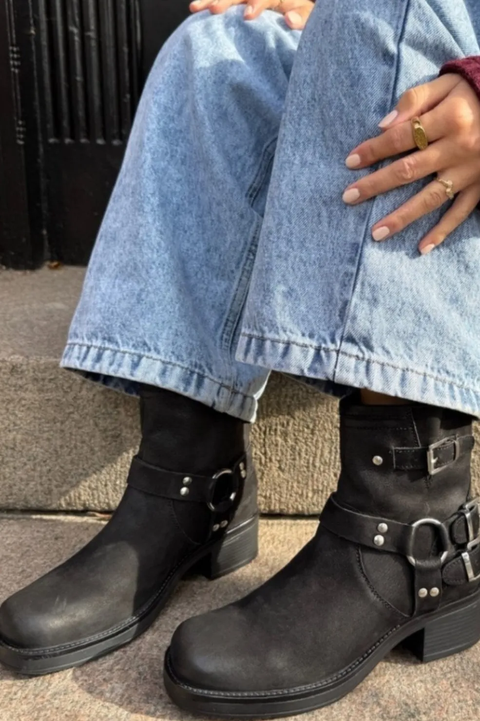 Sorte ankelstøvler fra Copenhagen Shoes i nubuck med remme og spænder i mørksølv. Støvlen har en firkantet snude og en stabil blokhæl.
