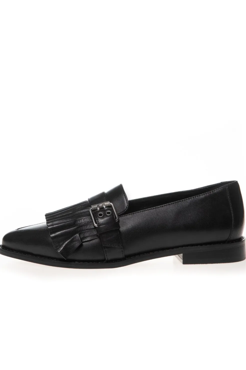 Sort lædersko med frynser og spænde fra Copenhagen Shoes. Den spidse tå og flade hæl giver skoen et klassisk udtryk, der passer til både kontoret og festen.