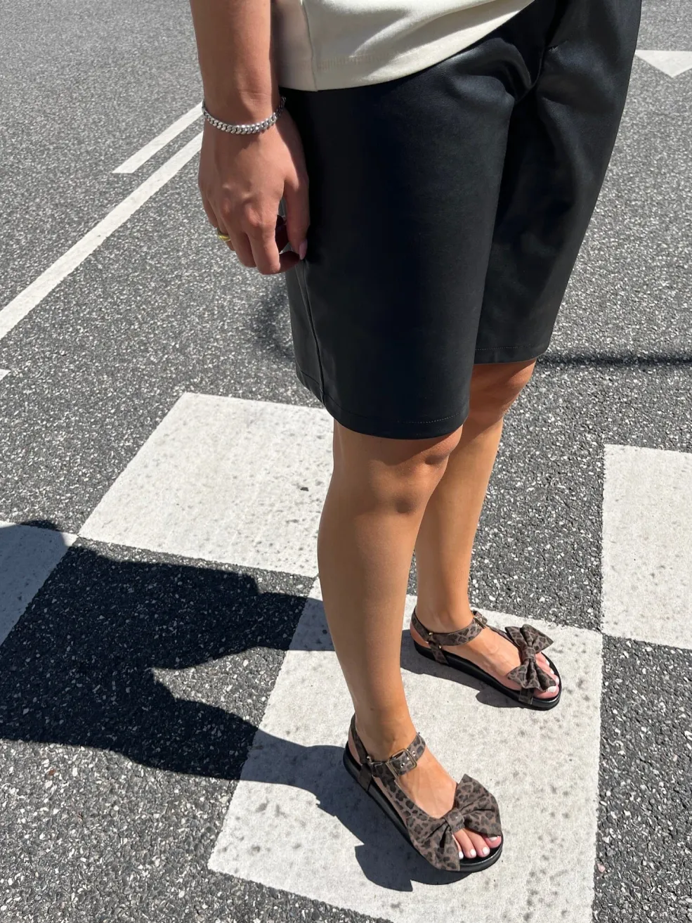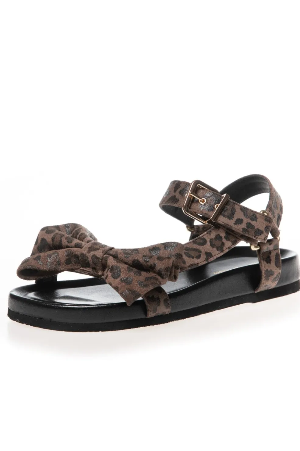 Sandal fra Copenhagen Shoes i ruskind og læder med leopardprint i nuancen Mouse. Den store sløjfe foran og spænde-lukningen giver sandalen et feminint udtryk.