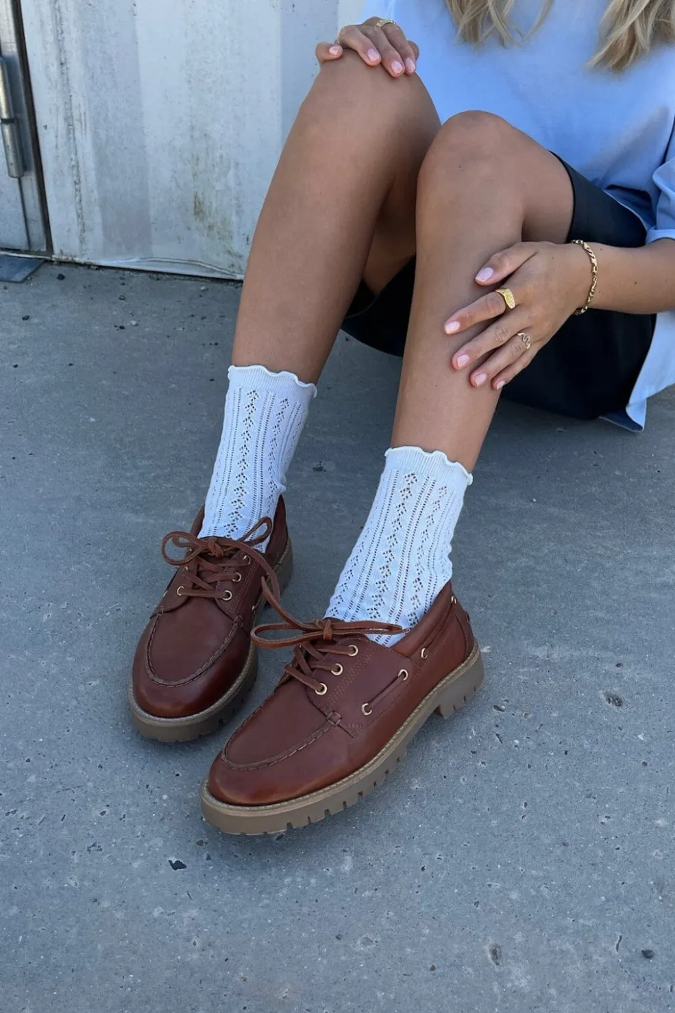 Brune loafers fra Copenhagen Shoes i læder med snørebånd. Skoene har en varm cognacfarve og klassiske syninger langs kanten.