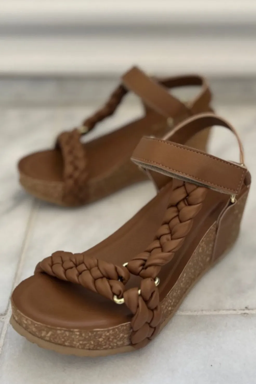 Cognacbrun sandal med flettede remme og kilehæl. Sandalen har en specialudviklet latexskum-indersål og er fremstillet i læder med guldaccessories og velcrolukning ved anklen.