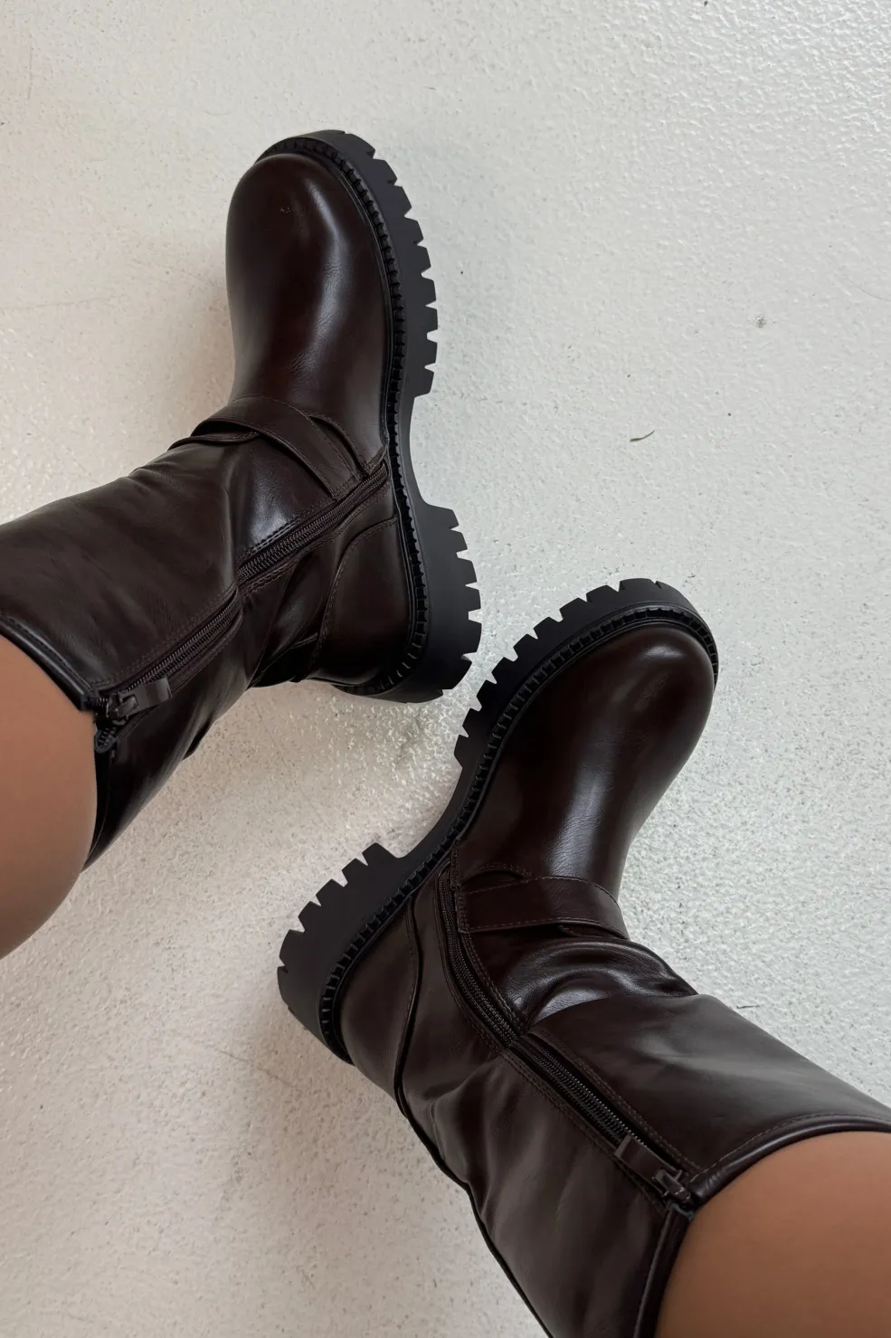Støvler fra Bloom i mørkerød syntetisk materiale. Støvlerne har en rund tå og en blokhæl.