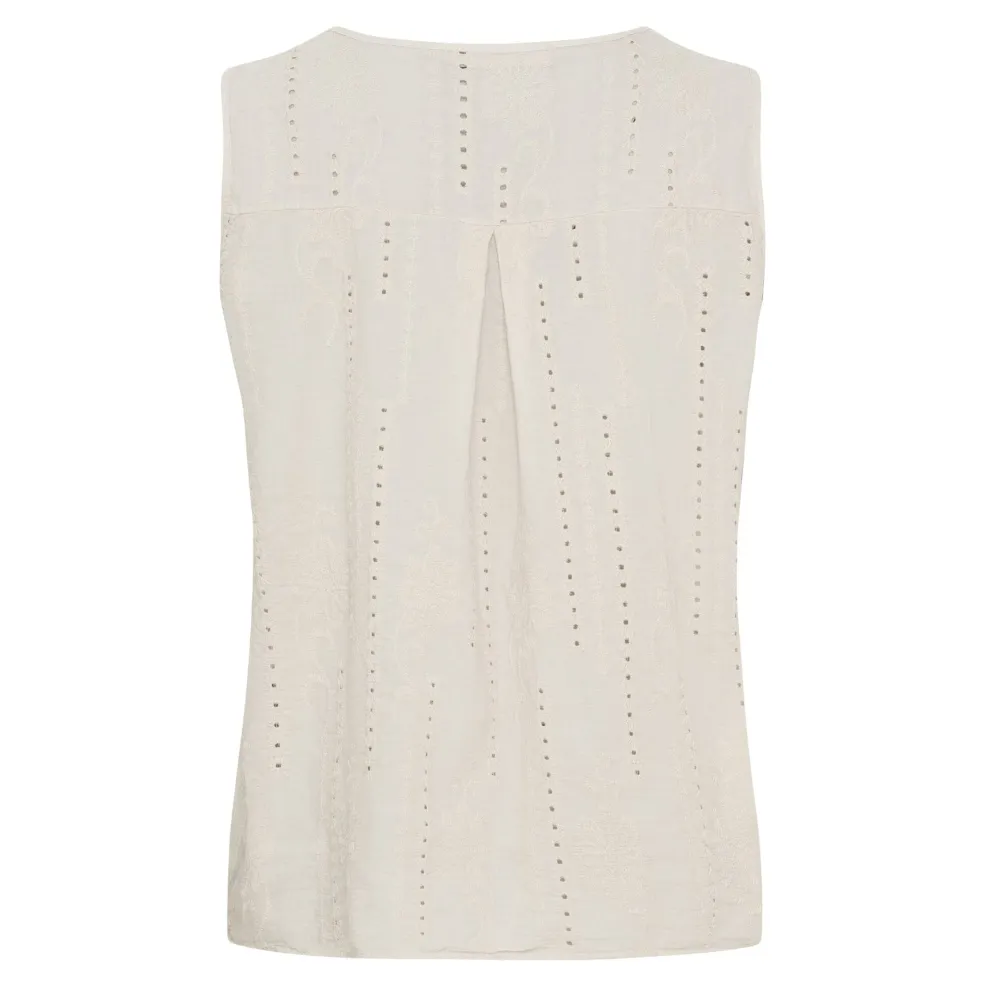 Beige top fra Marta Du Chateau med broderi og knaplukning foran. Toppen har et blomstret mønster i broderiet og en v-halsudskæring, der giver den et håndlavet præg.