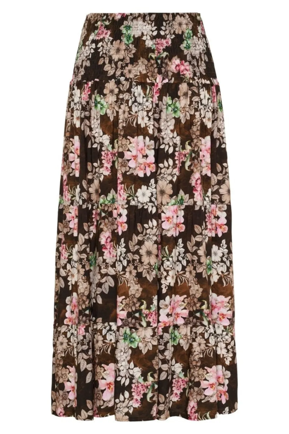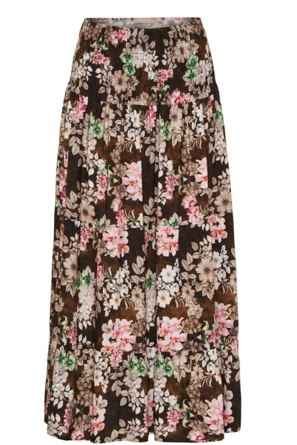Lang nederdel fra Marta Du Chateau i brun med blomsterprint. Nederdelen har et mønster i hvide, pink og grønne nuancer samt rynkeeffekt ved den elastiske talje.