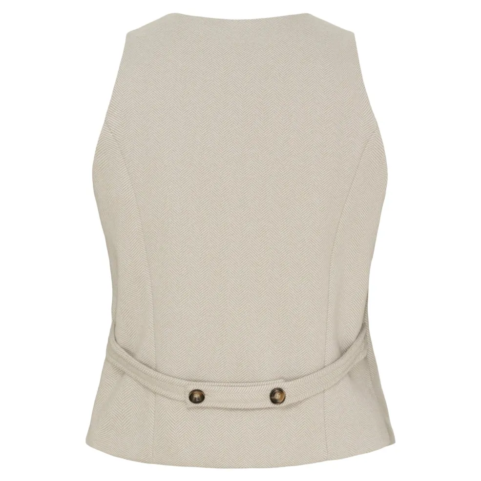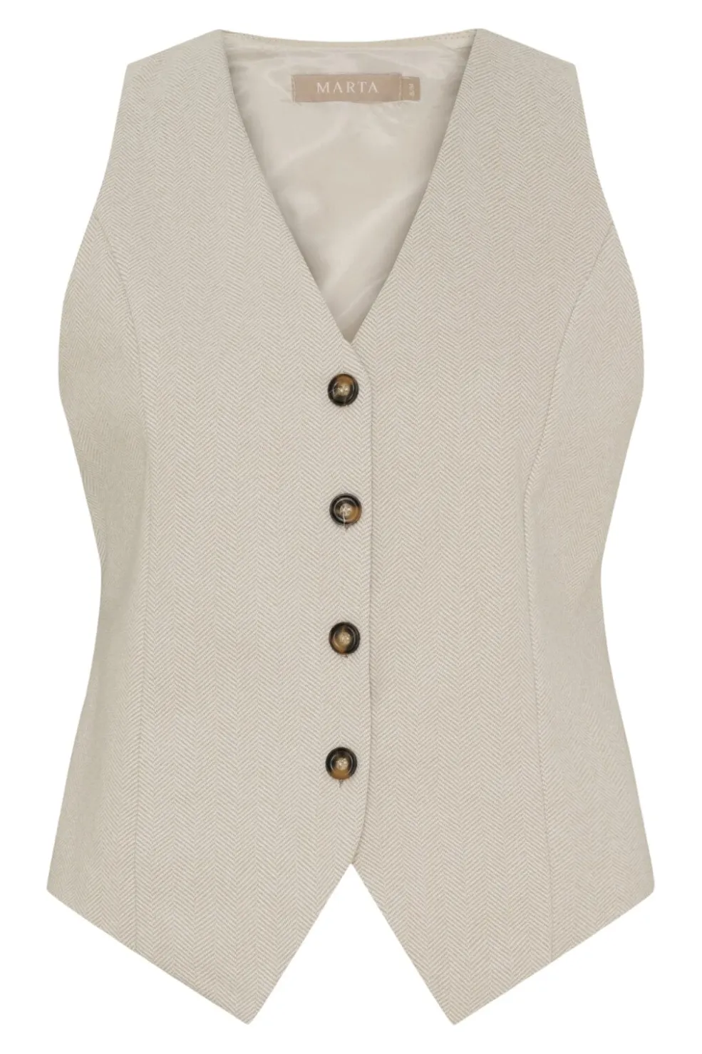 Beige vest fra Marta Du Chateau med fiskebensmønster. Den ærmeløse vest har en dyb V-udskæring og knapper foran.