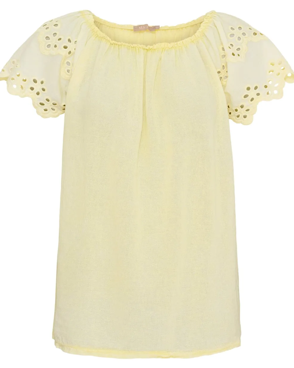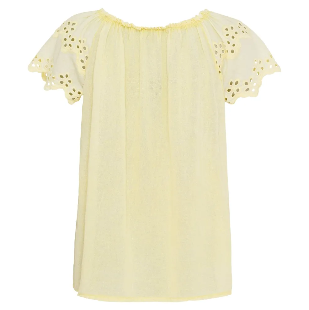 Gul bomuldsbluse fra Marta Du Chateau med off-shoulder design og broderede ærmer. Blusen har en løs pasform og korte ærmer med blomsterbroderi.