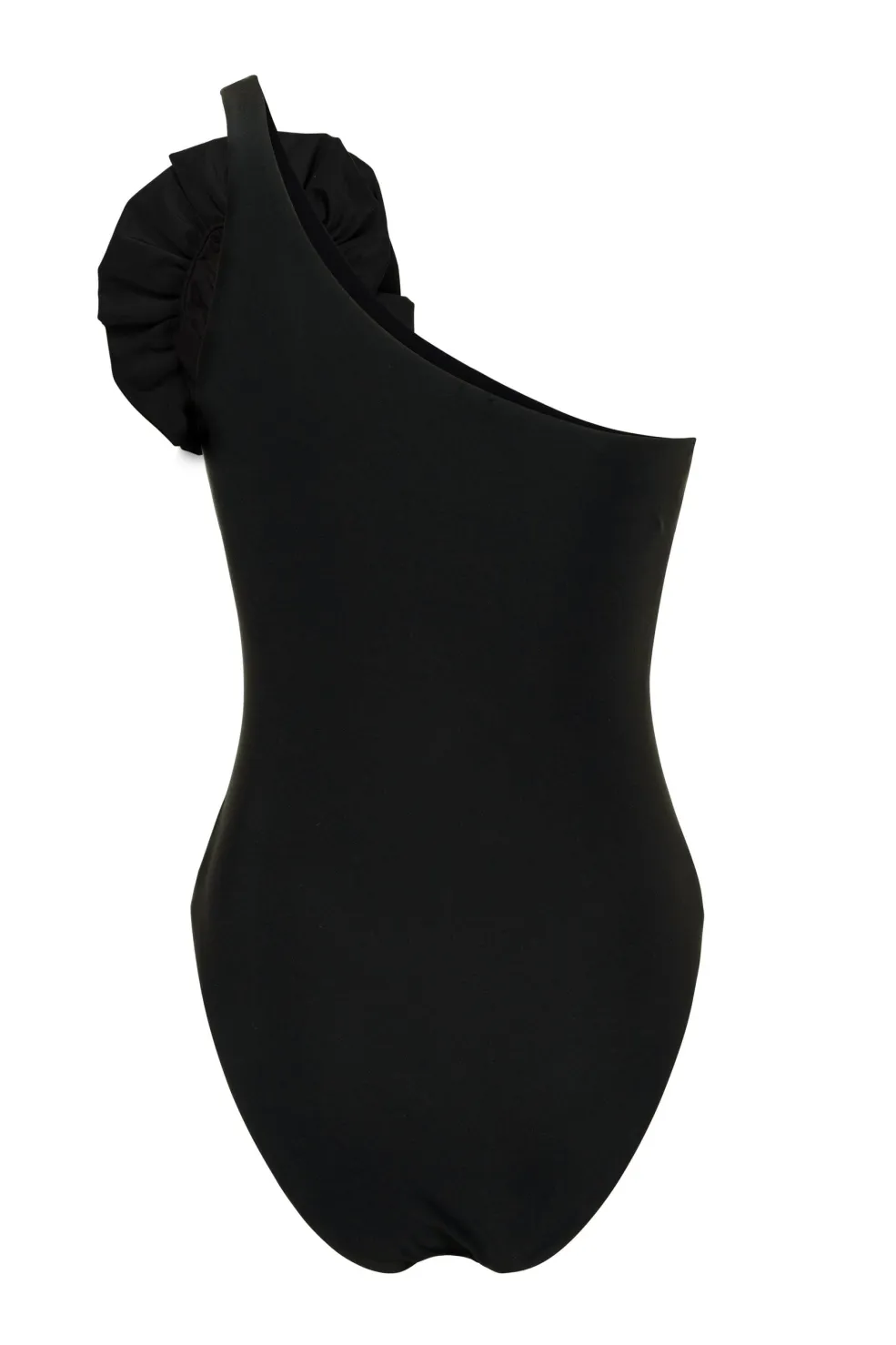 Sort badedragt fra Cras med en stor blomsterdetalje ved skulderen. Den har et off-shoulder design med en enkelt skulderrem og et højt skåret ben.