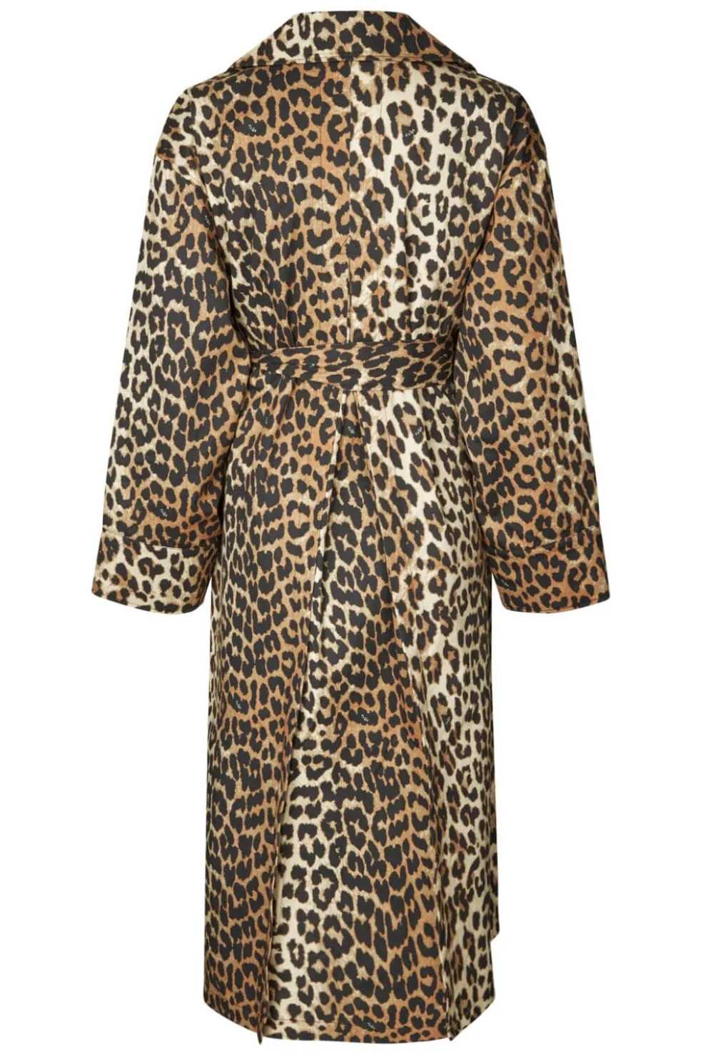 Trenchcoat fra Cras med leopardmønster i brune og beige nuancer. Frakken har en rund hals, knaplukning foran og et bælte i taljen, der kan justeres efter behov.
