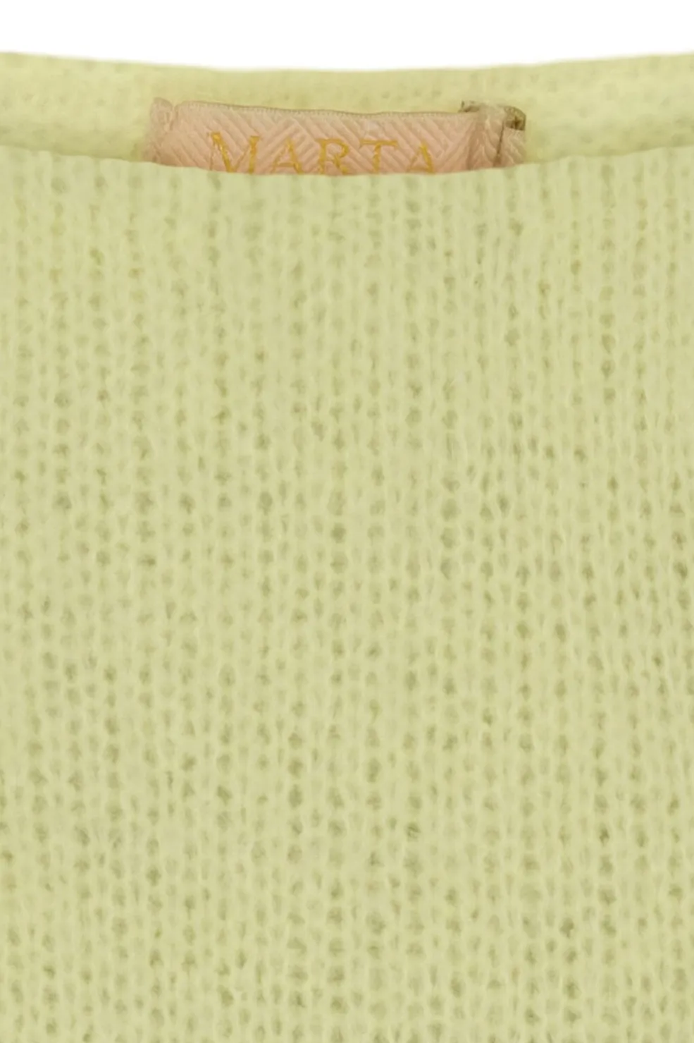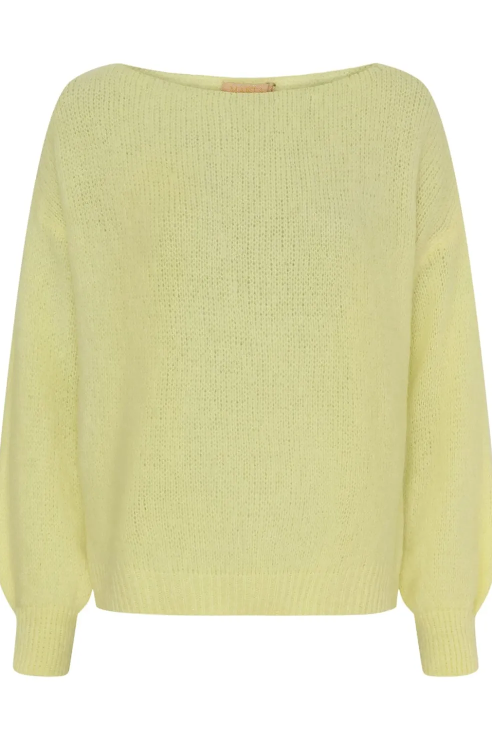 Gul strikbluse fra Marta Du Chateau i primula-farvet garn. Den løse model har off-shoulder halsudskæring og pufærmer, som giver den et særligt præg.
