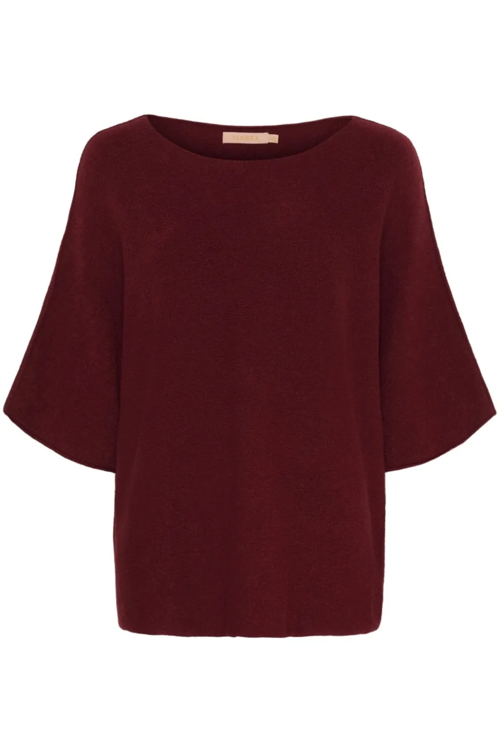 Vinfarvet striktrøje fra Marta Du Chateau med rund halsudskæring og 3/4 ærmer. Strikken har en løs, oversized pasform og er lavet af en blød materialeblanding.
