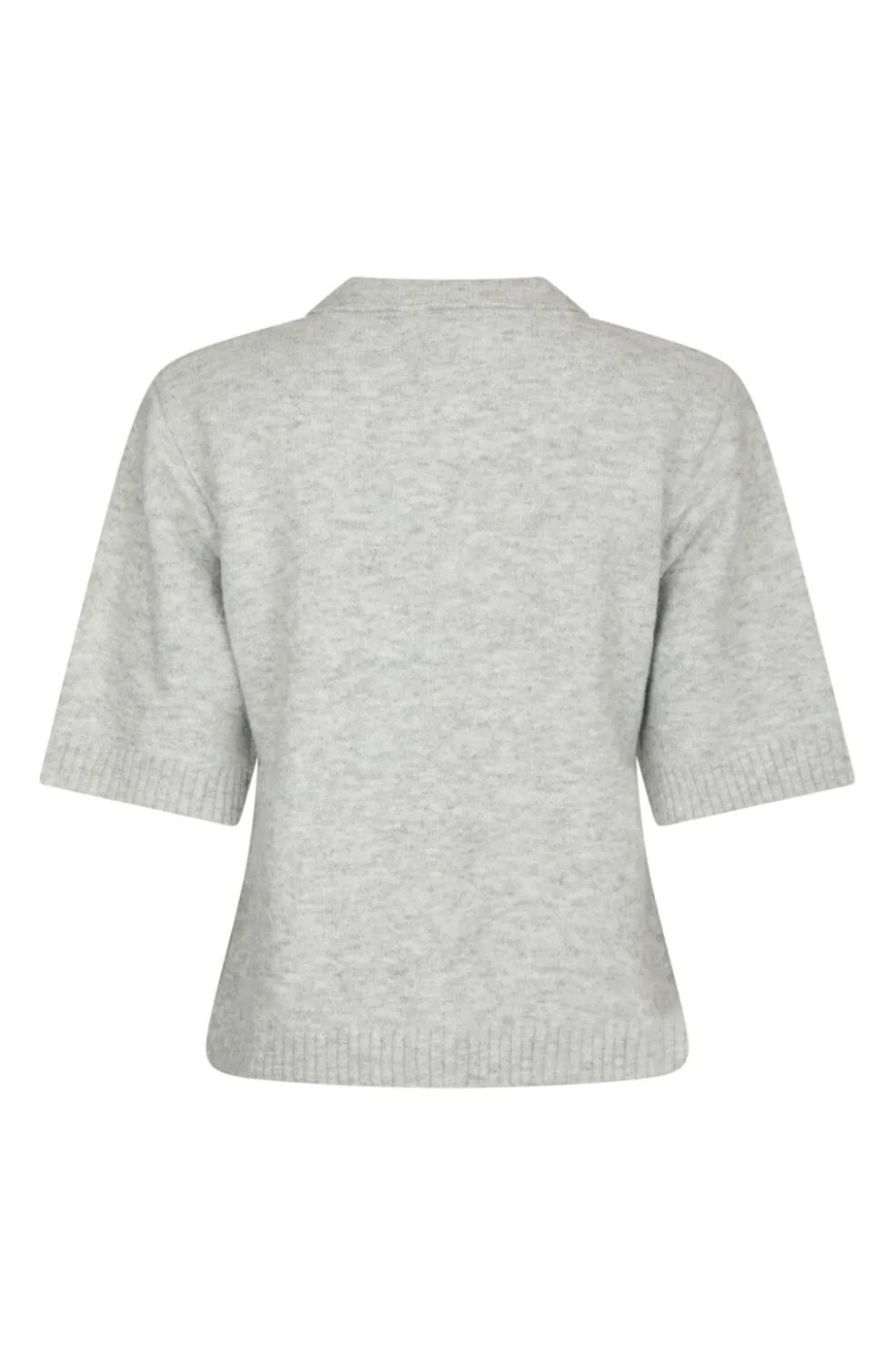 Strikbluse fra Neo Noir i lys grå melange med korte ærmer, krave og knaplukning foran. Blusen er strikket i en materialeblanding med uld.