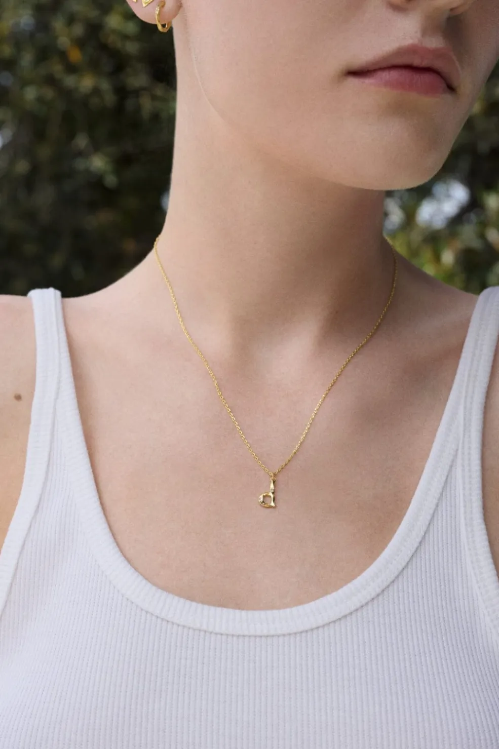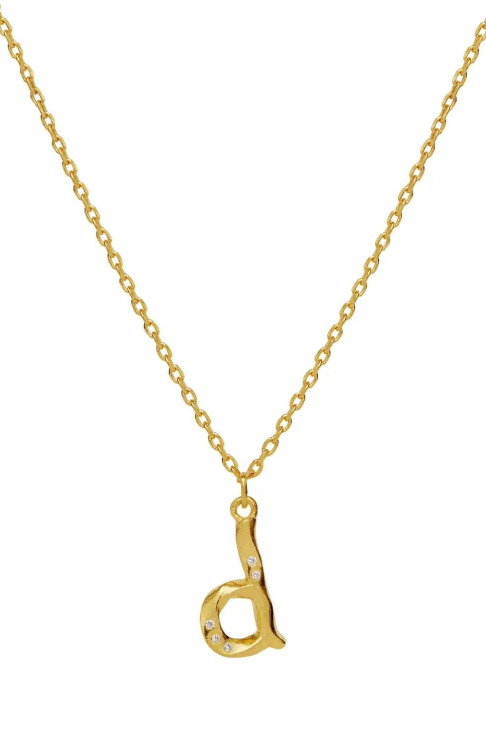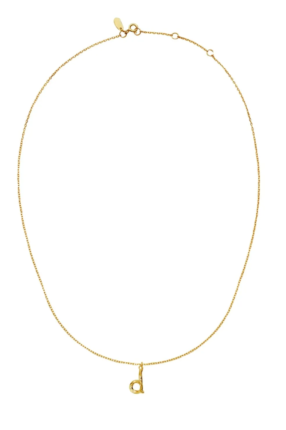 Gyldent halskæde fra Maanesten med D-bogstav som vedhæng. Smykket er lavet af genanvendt sterlingsølv med guldbelægning og har fine detaljer i designet.