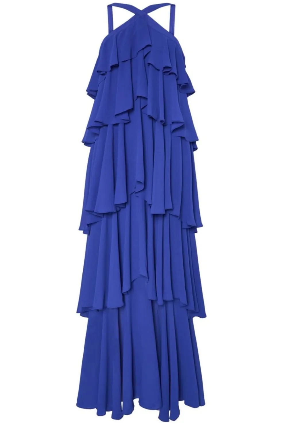 Blå maxikjole fra Y. A.S med halterneck-udskæring. Kjolen har flere lag af flæser fra top til bund og krydsede stropper i ryggen.