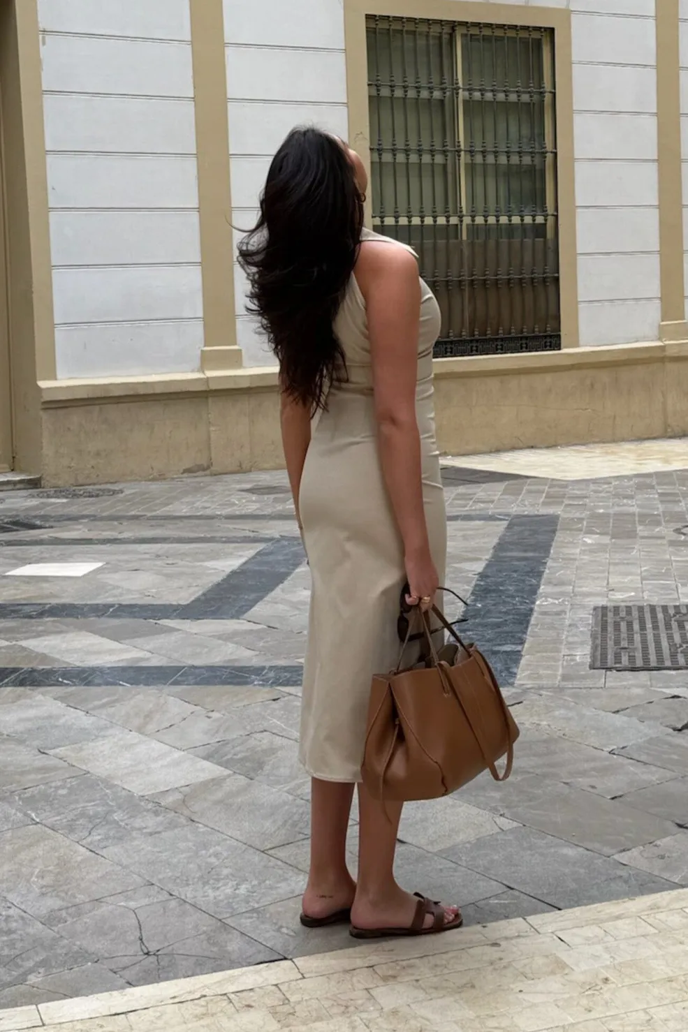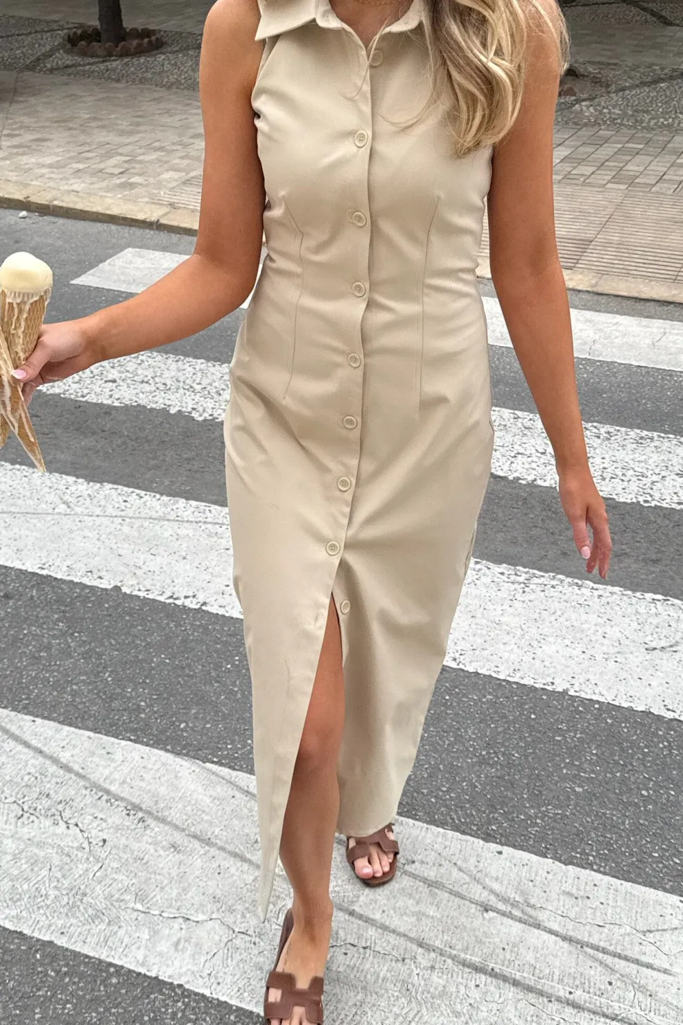 Lang kjole fra BYIC i beige med skjortekrave. Kjolen har knaplukning hele vejen ned og et ærmeløst design med slids foran.